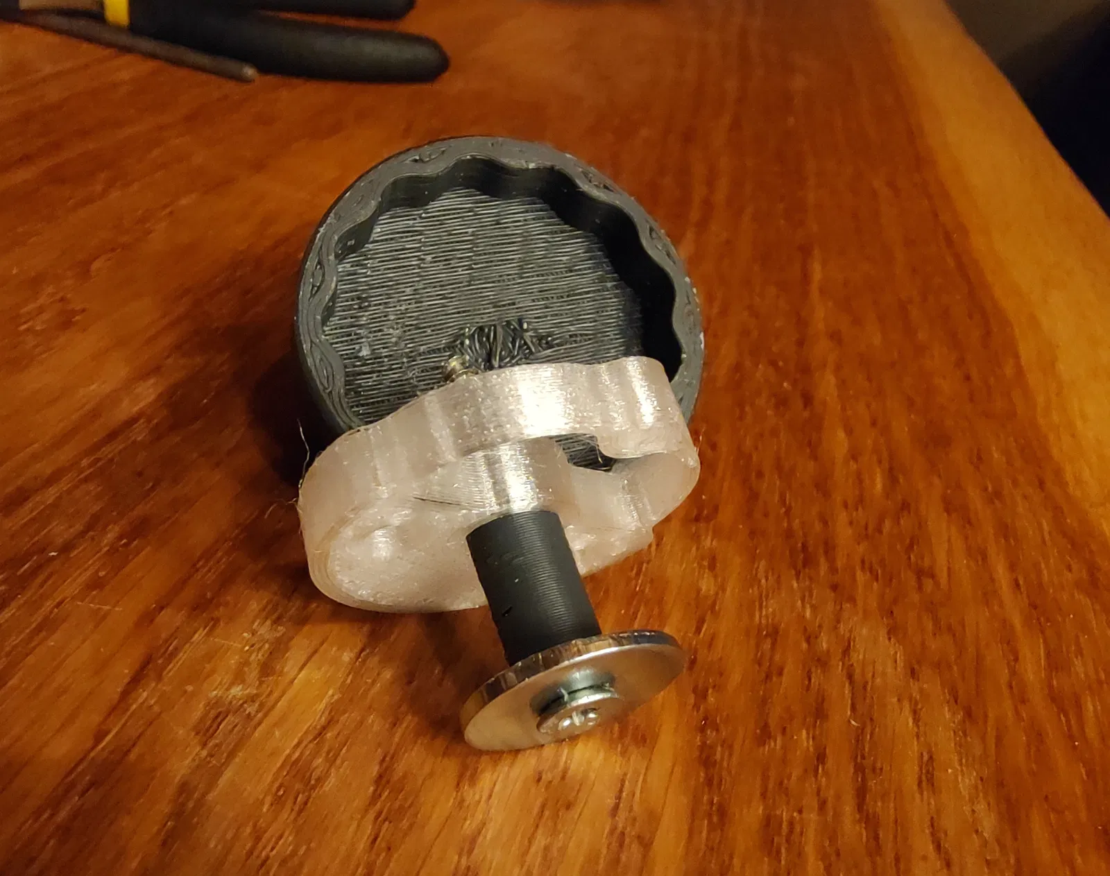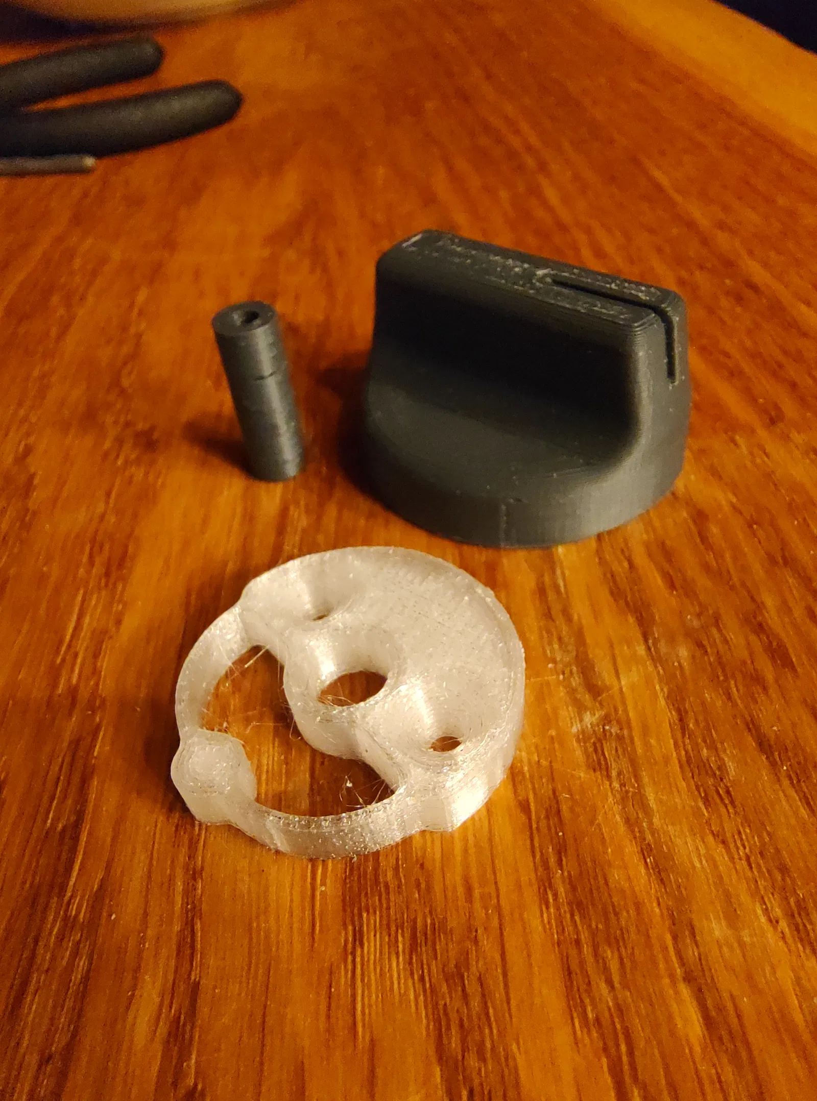 Mình in núm xoay và ống lót bằng nhựa ABS, còn phần bánh răng thì dùng nhựa PETG. Cần dùng support khi in núm xoay nhé.