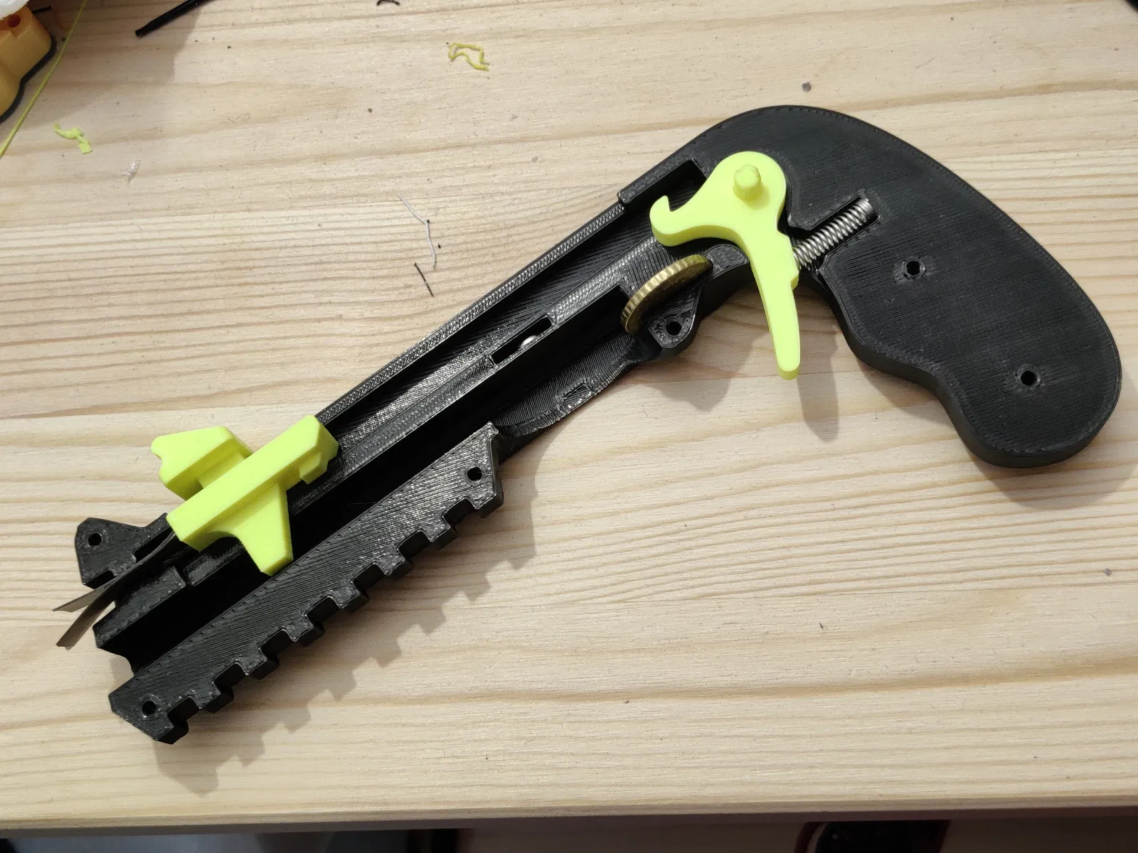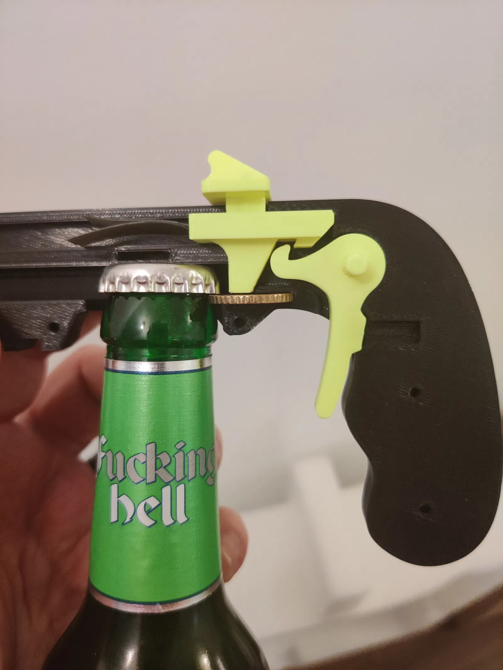 Cuối cùng tôi cũng làm xong và ngay cả nguyên mẫu đầu tiên cũng hoạt động hoàn hảo. Cơ chế cò súng mới cảm giác rất tuyệt. Tuy nhiên... tôi sẽ phải làm lại phần thân từ đầu nếu muốn thêm tính năng. Khi đóng gói để đăng lên PrusaPrinters, tôi thấy cuộc thi Bottle Opener Contest. Thật là trùng hợp! :-)