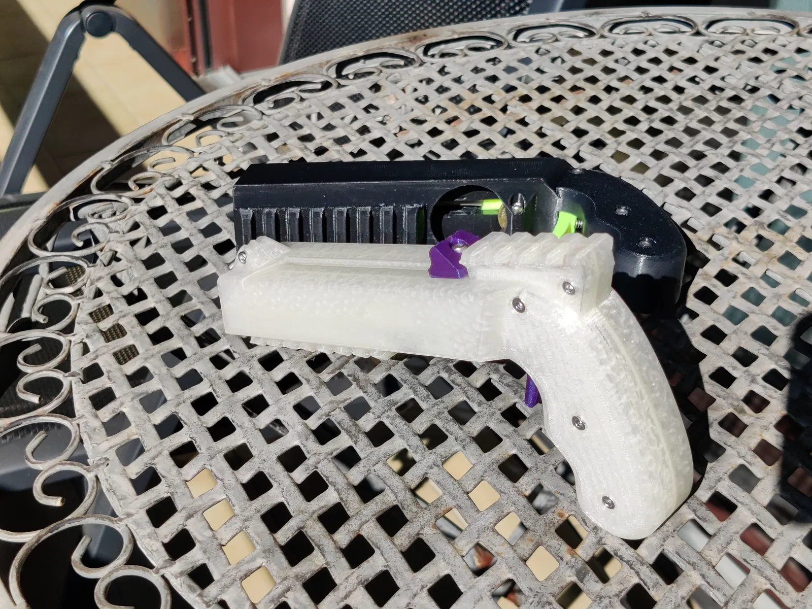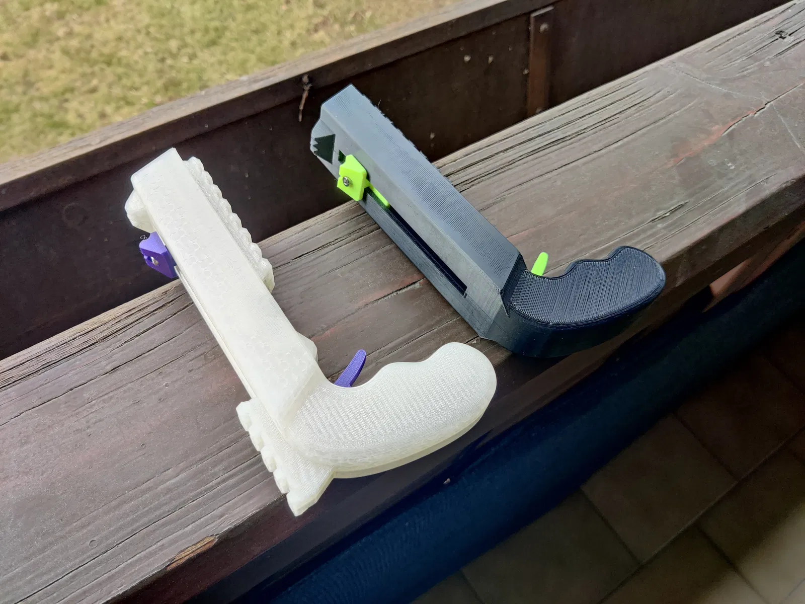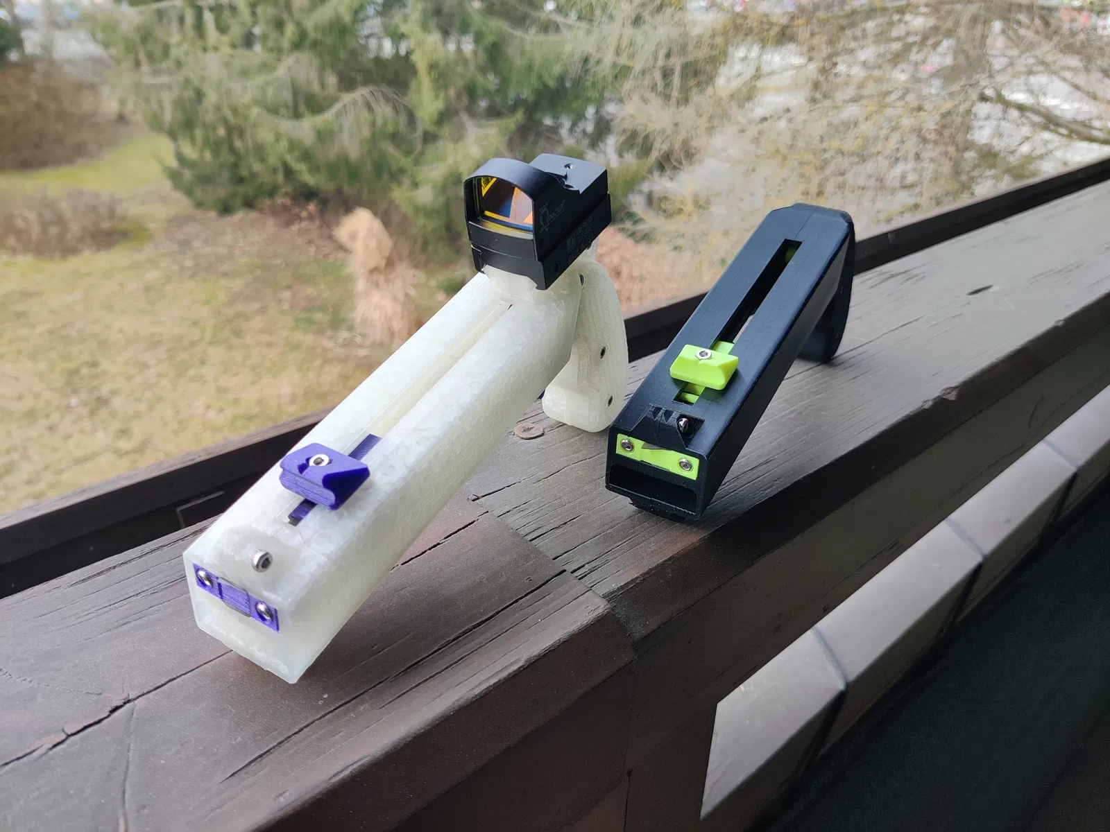 Câu chuyện chi tiết: Tôi vừa in xong một khẩu bằng PETG. Màu xanh lá và xanh dương của Prusament PETG trông rất tuyệt. Tuy nhiên, nó vỡ ngay phát bắn đầu tiên. Tác động của thanh trượt vào phía trước làm nứt cả hai bên nòng. Tôi không ngờ PETG lại dễ bị vỡ do sốc như vậy.
