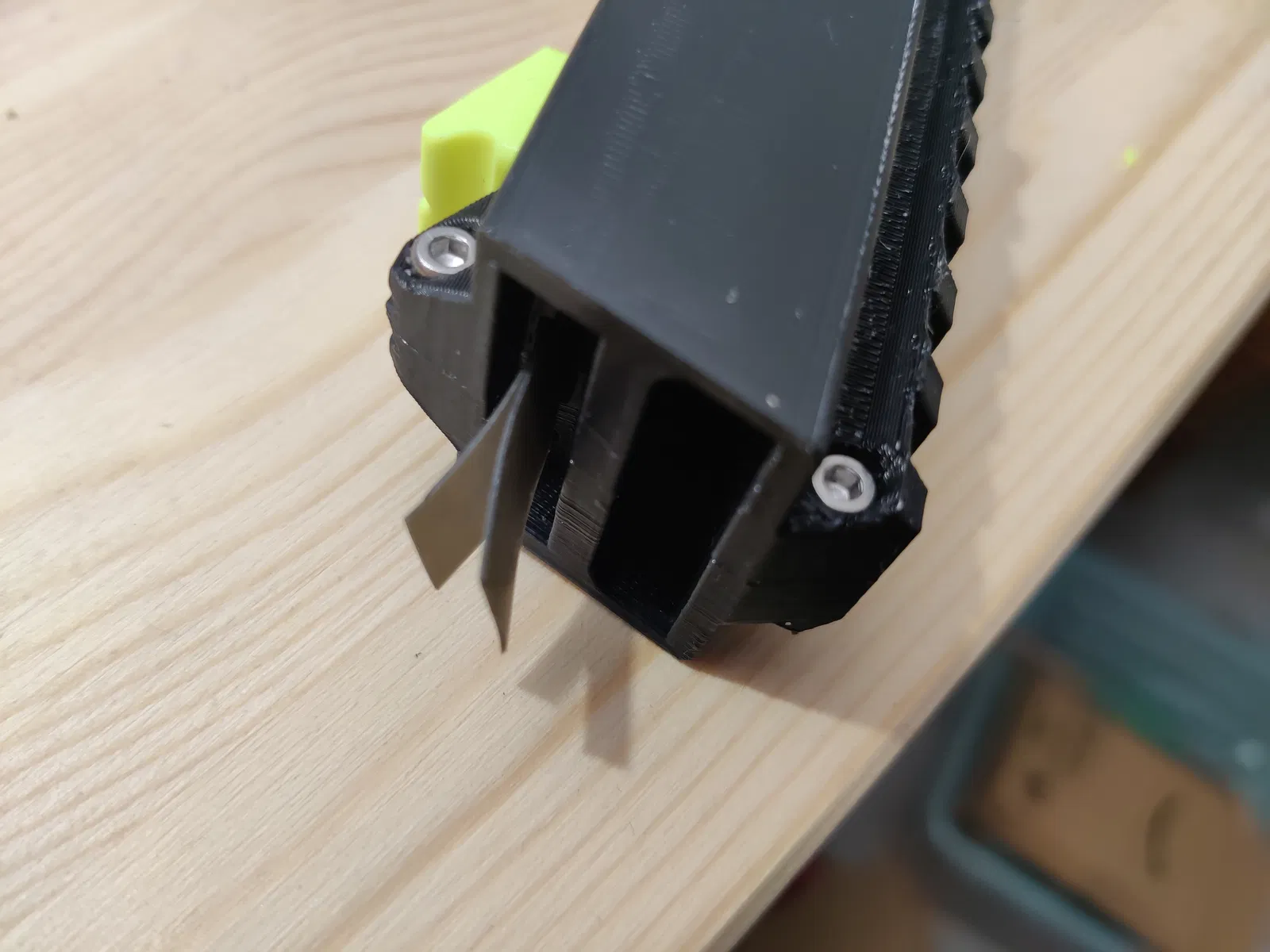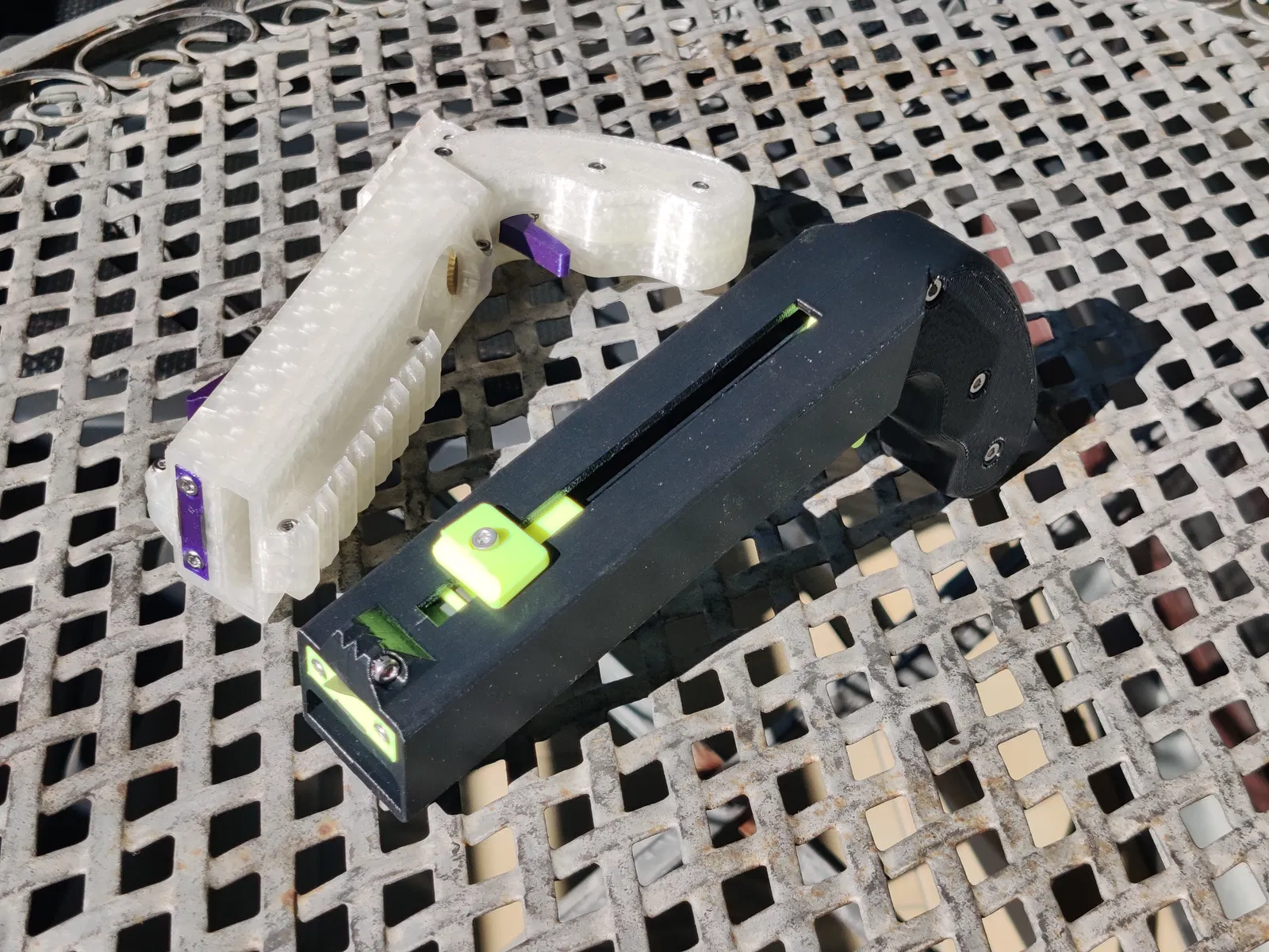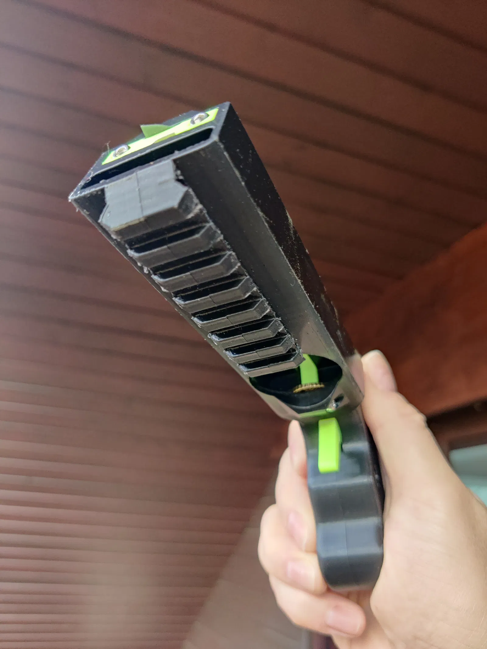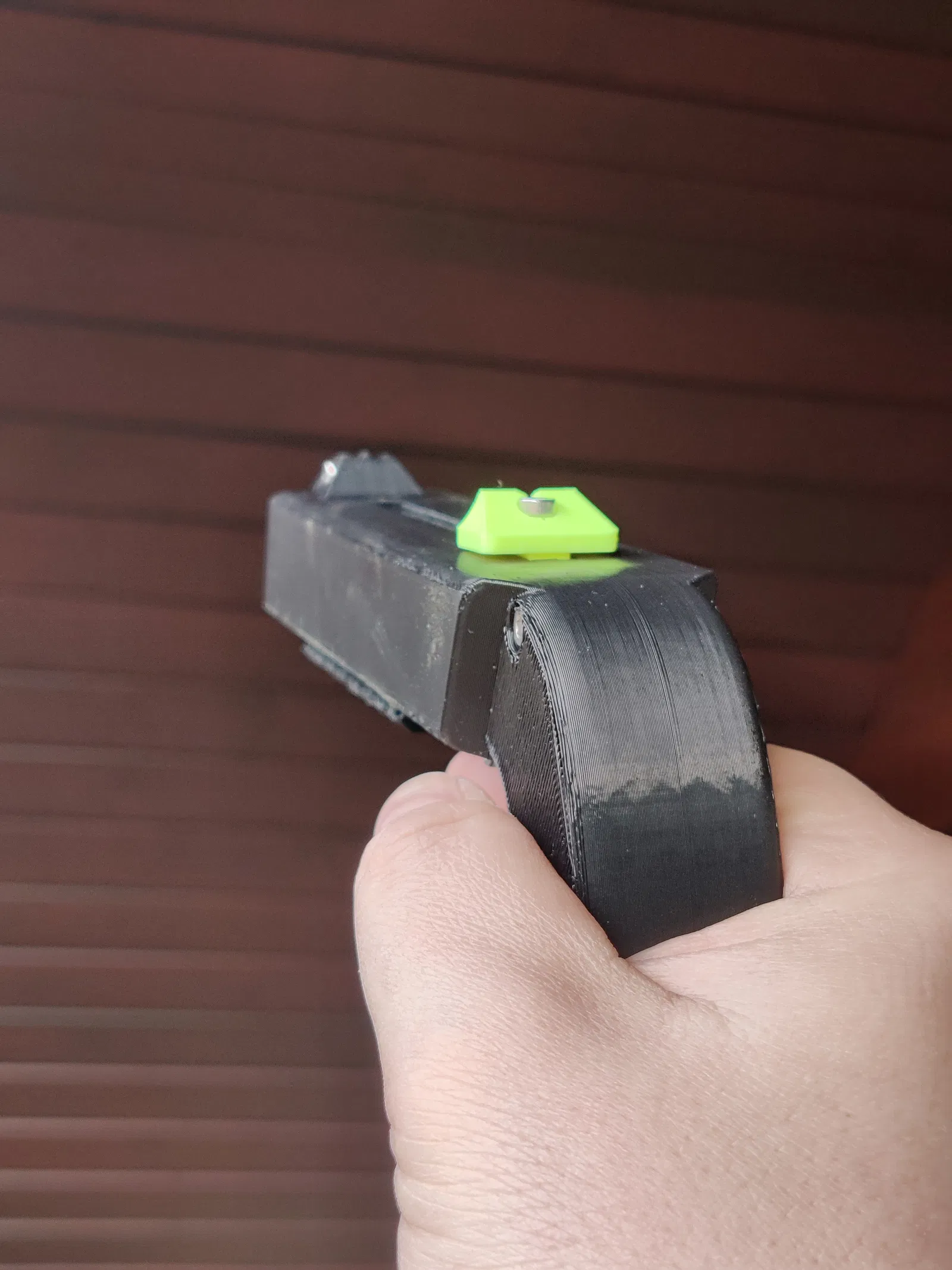 Câu chuyện chi tiết: Tôi vừa in xong một khẩu bằng PETG. Màu xanh lá và xanh dương của Prusament PETG trông rất tuyệt. Tuy nhiên, nó vỡ ngay phát bắn đầu tiên. Tác động của thanh trượt vào phía trước làm nứt cả hai bên nòng. Tôi không ngờ PETG lại dễ bị vỡ do sốc như vậy.