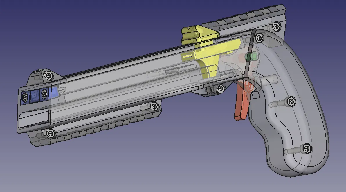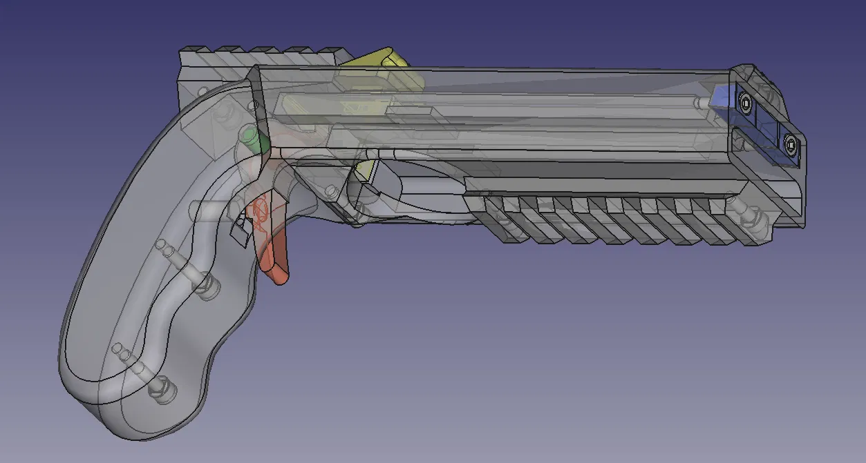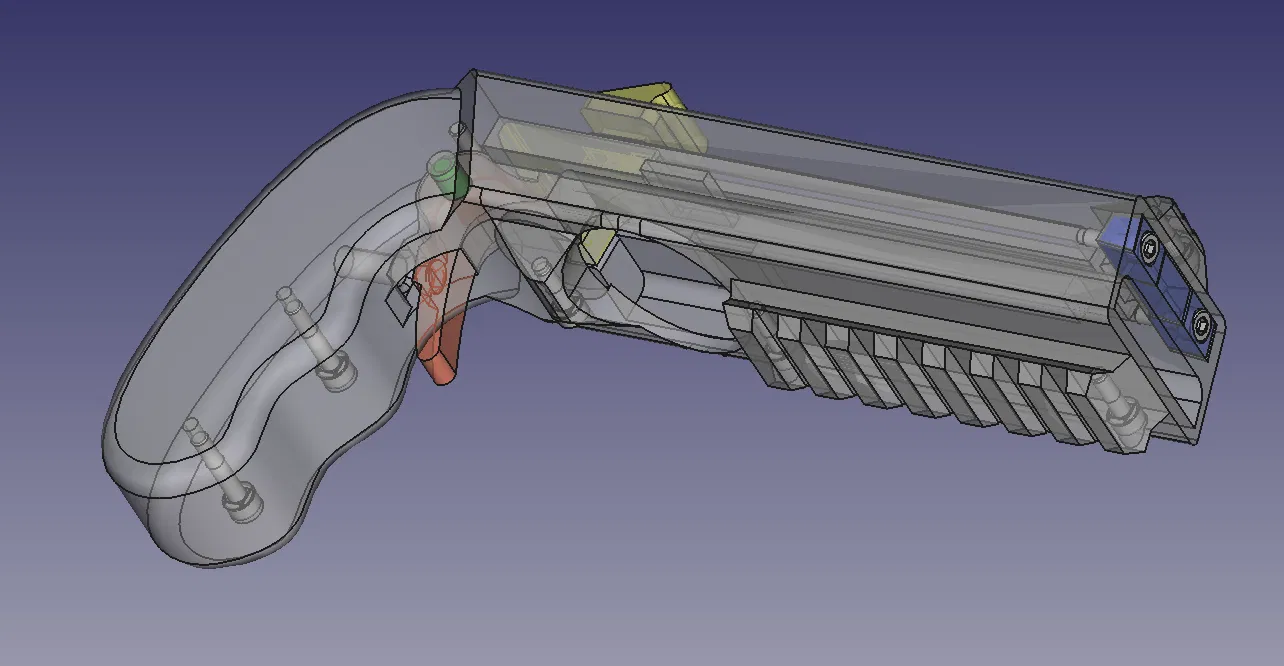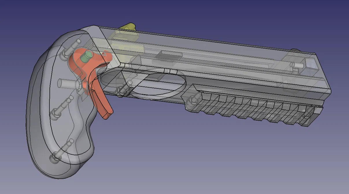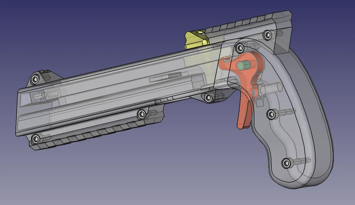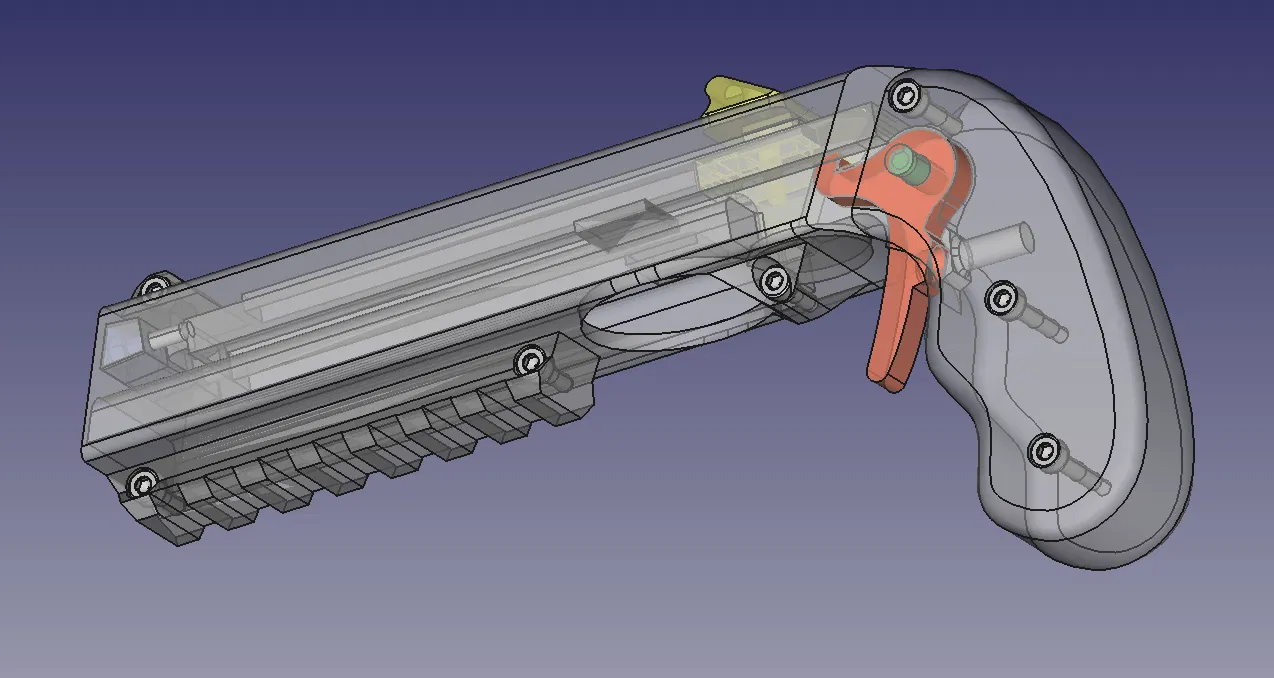 Mọi thứ bắt đầu vào mùa hè 2021 khi tôi tình cờ thấy bản gốc. Tôi in ra và thấy nó rất tuyệt, nhưng cò súng quá dài làm tôi khó chịu. Tôi phải di chuyển ngón giữa ra để nhấn. Vì vậy, tôi đưa nó vào FreeCAD và làm ngắn lại. Sau đó, thanh trượt bị kẹt nhẹ khi kéo về. Thỉnh thoảng súng bị kẹt do nắp chai không khớp. Tôi chưa bao giờ có loại dây thun như thiết kế gốc và cũng không thích cái nút thắt ở phía trước. Sau đó, tôi bắt đầu thiết kế lại thanh trượt trong FreeCAD (vì dùng Linux nên không dễ dùng Fusion360 hay các công cụ Windows khác) và đó đúng là một cơn ác mộng. Mỗi lần thay đổi một chút ở phần trên, mọi thứ phía dưới đều hỏng và phải làm lại toàn bộ. Phần lớn là lỗi của tôi khi chồng chéo các tính năng lên nhau. Tôi không biết cách làm tốt hơn và các bài hướng dẫn cũng chỉ làm thế thôi.