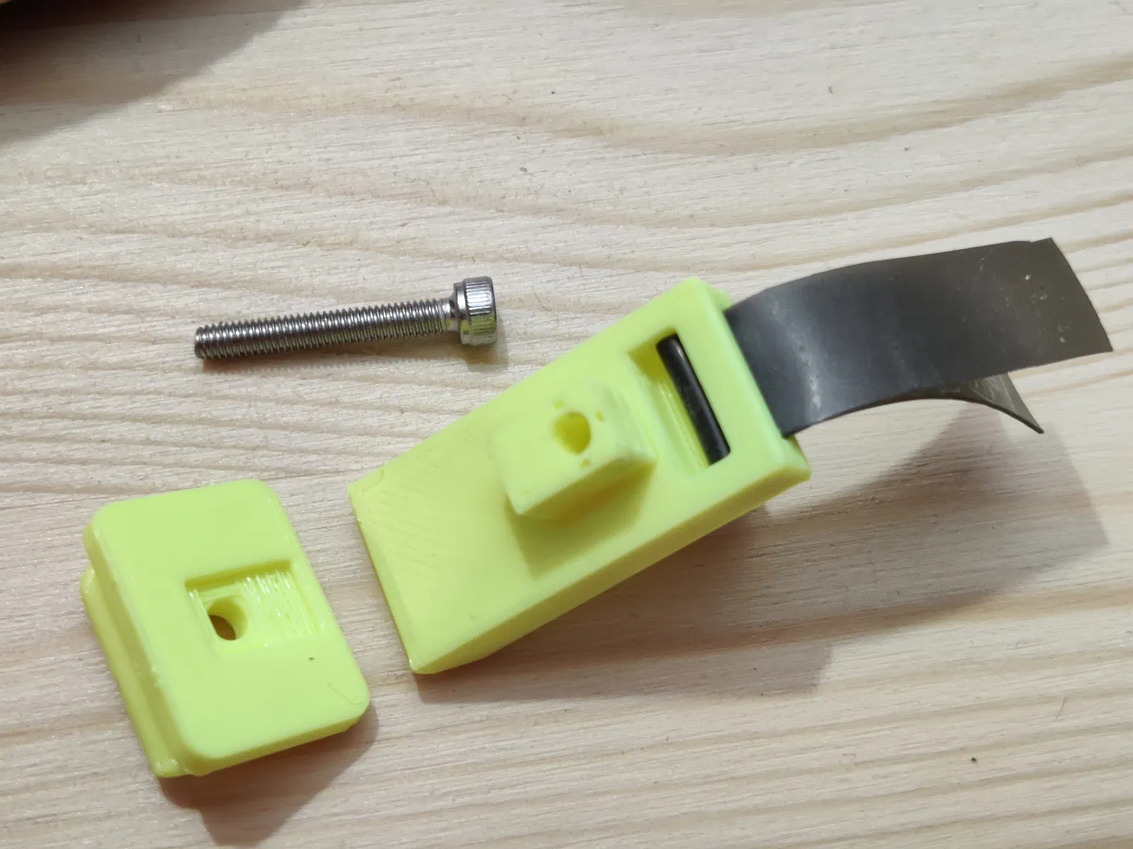 Đặt khối trượt (chú ý chiều, nó không còn đối xứng nữa!) vào trong và đặt thanh khóa lên trên. Dùng vít 20mm để cố định các chi tiết.