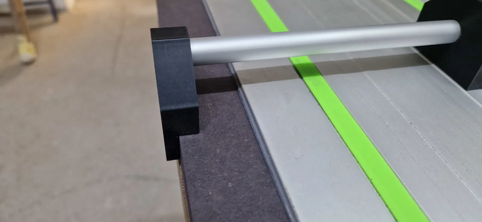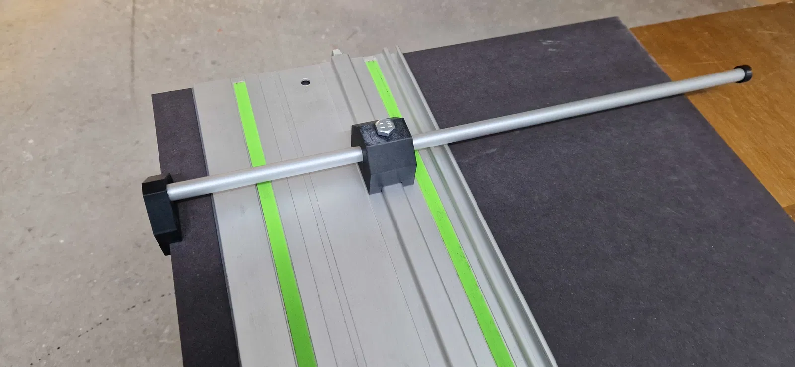 Lấy cảm hứng từ video này, mình đã tự thiết kế một bộ cữ chặn song song (parallel guide) cho thanh ray trượt, giúp cắt các dải gỗ đều nhau bằng máy cưa đĩa cầm tay (track saw).
