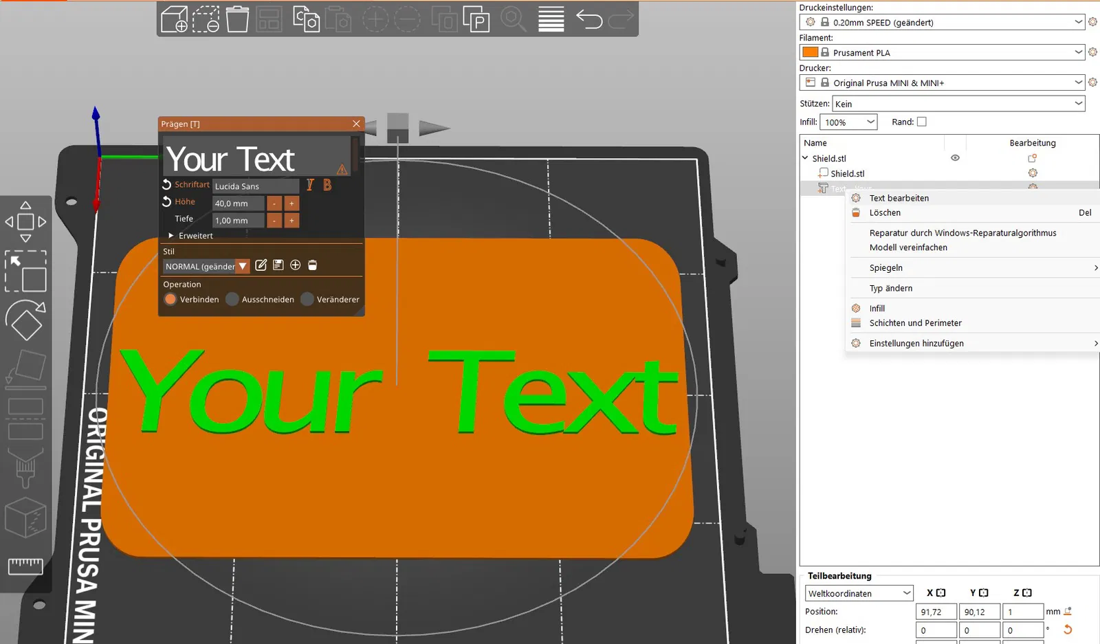 Để tùy chỉnh nội dung văn bản, bạn chỉ cần nạp file “Shield” vào Prusa Slicer, chuột phải vào phần văn bản và chỉnh sửa theo ý thích.