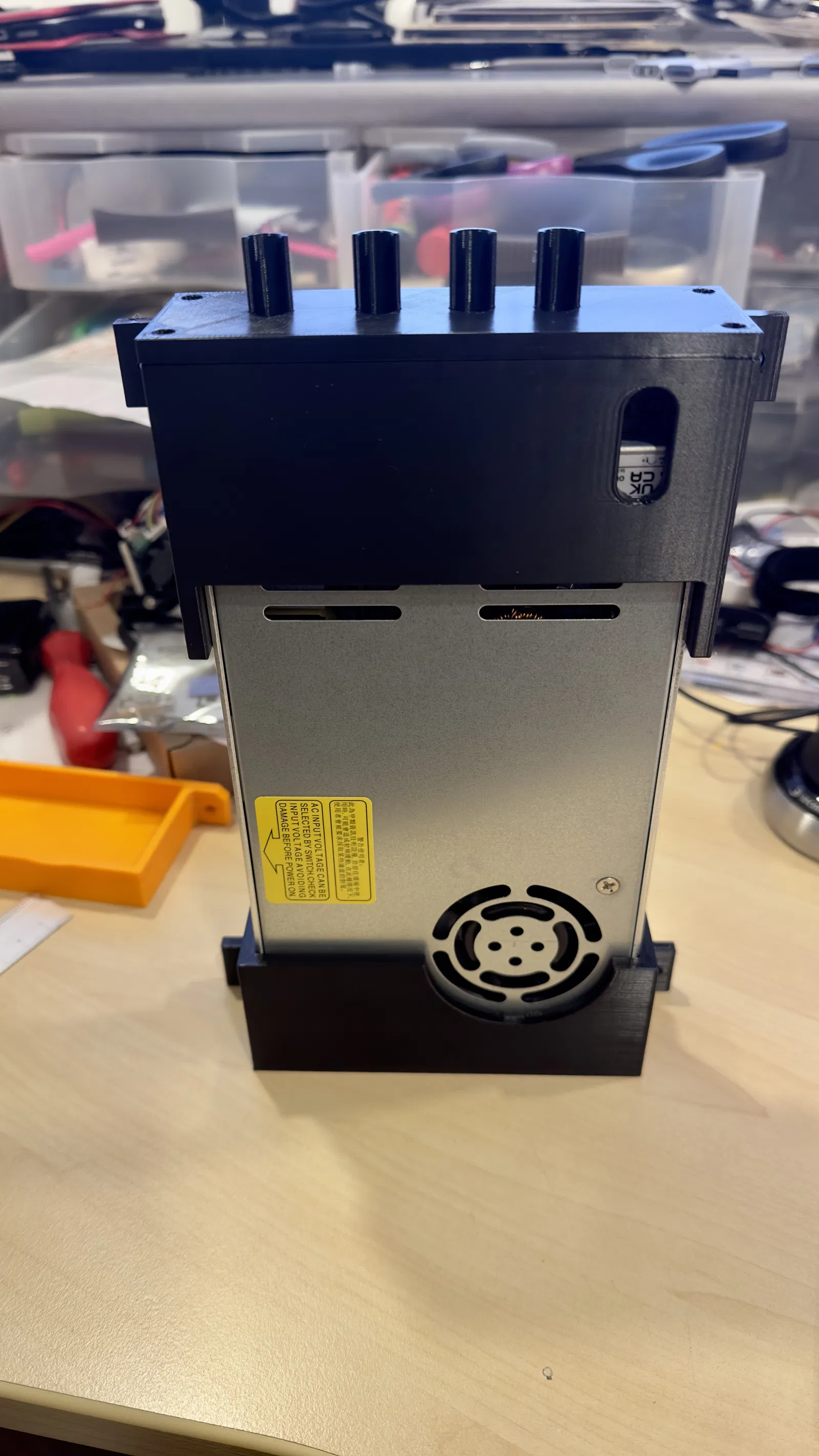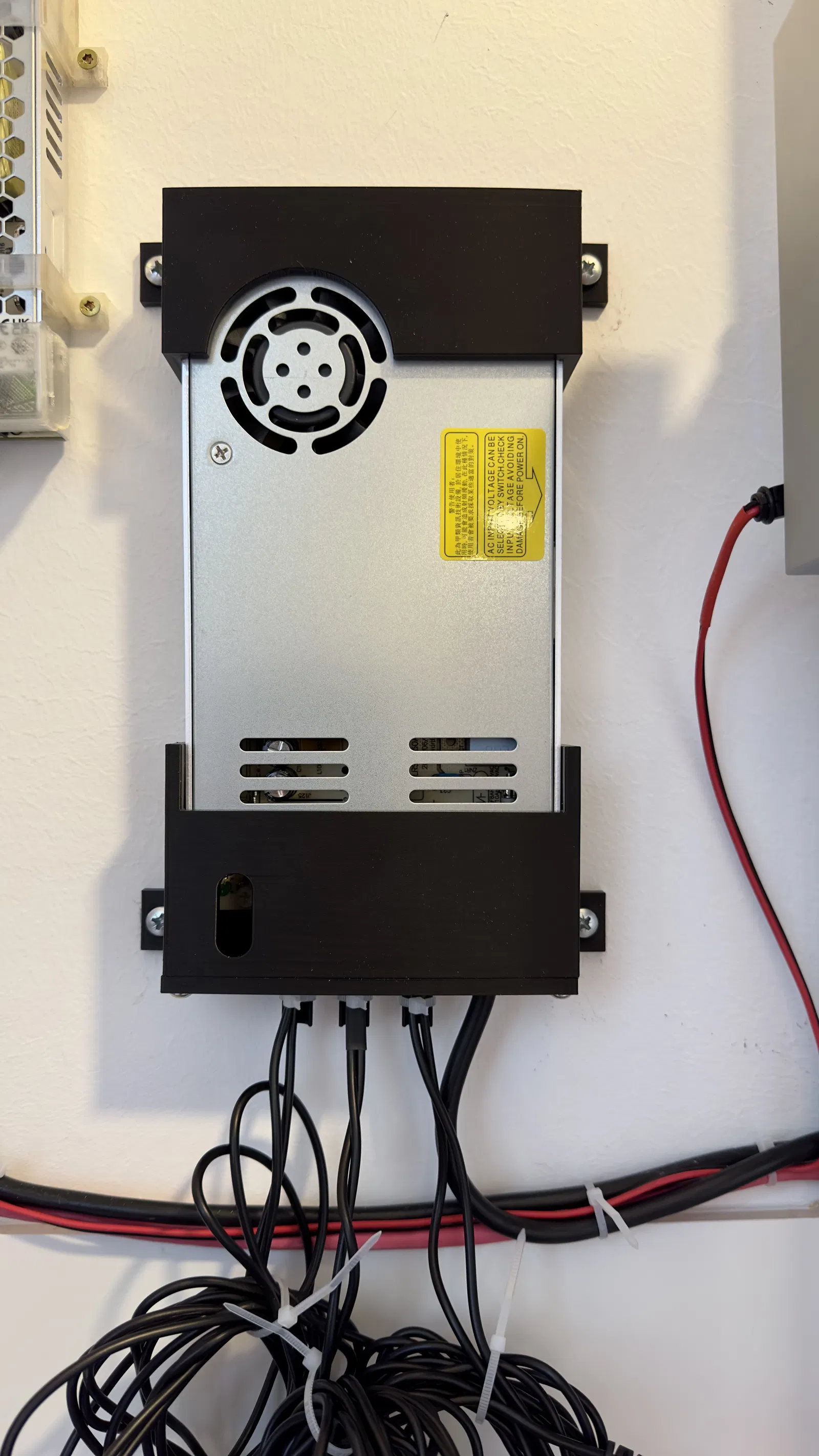 Mình thiết kế giá treo tường cho bộ nguồn Meanwell LRS-350-24 dùng để cấp điện cho máy sấy nhựa. File được tách rời phần chắn dây giúp in ấn dễ dàng và tiện lợi hơn. Đã in thử nghiệm thành công bằng nhựa eSun PLA+ trên máy A1 mini.