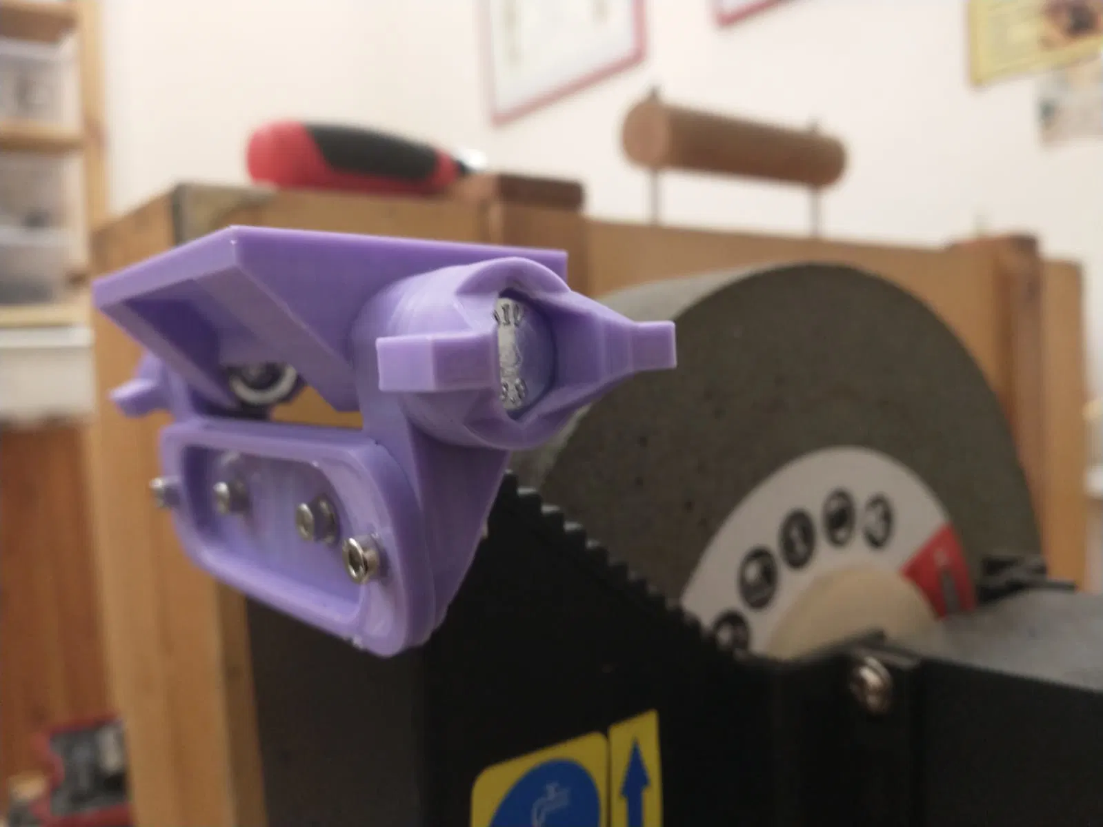 Bạn hãy in 2 miếng giữ ốc, sau đó lắp 2 bu lông 8mm vào đó. Ép chặt 2 đai ốc vào phần đế máy bào (chỗ có các hốc lục giác). Sử dụng ốc vít M3 để cố định phần thanh tăng cứng vào khớp nối chính. Gắn bộ jig vào thùng nước bằng 2 vít M3. Hãy cẩn thận căn chỉnh jig và bánh mài sao cho thật chuẩn xác.