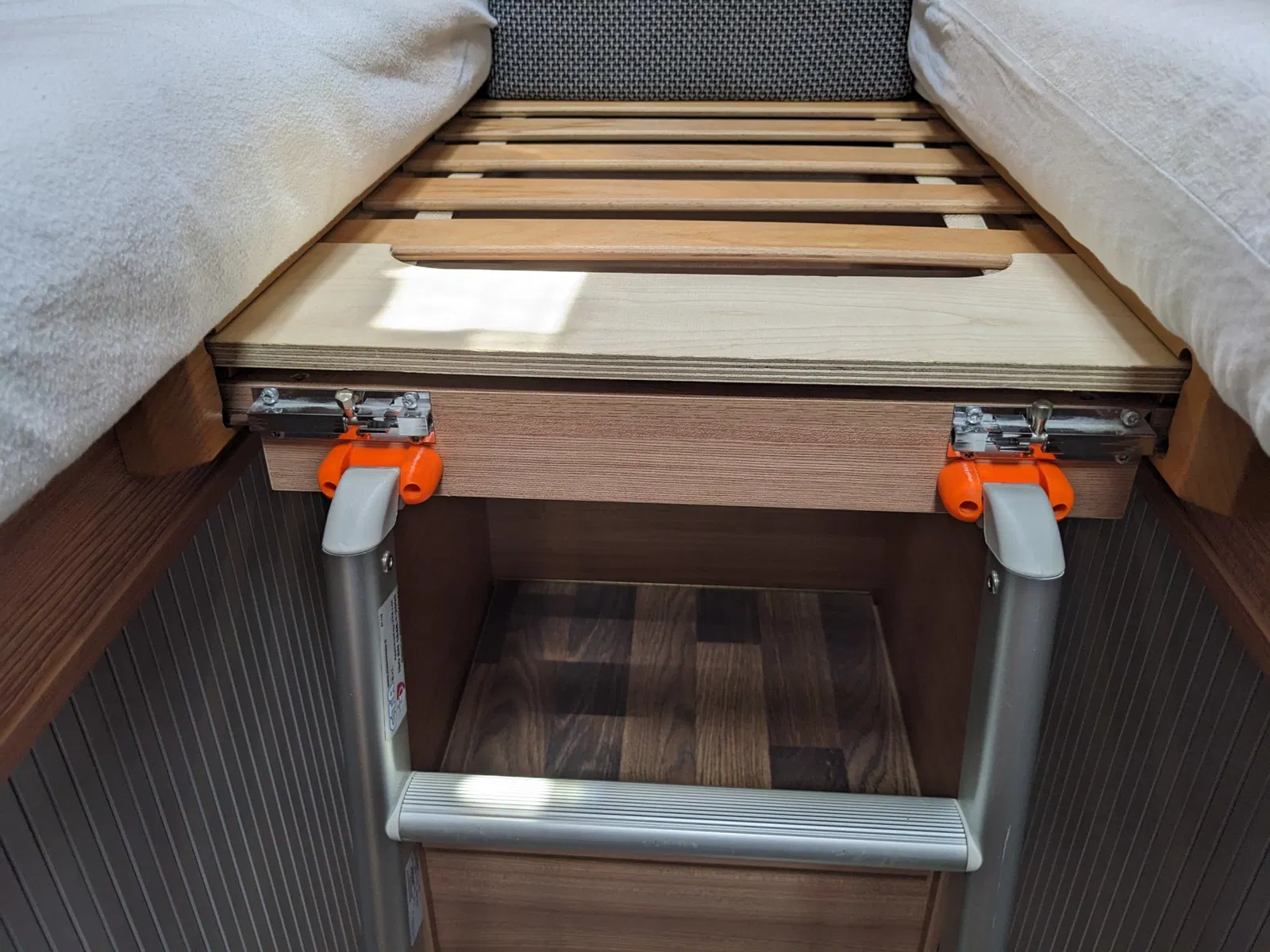 Bảng gắn cầu thang giường cho cầu thang có thể tháo rời đến giường ở phía sau của Knaus SkyWave 650 MEG Camper và có thể nhiều loại khác vì đây là một phần tiêu chuẩn để gắn cầu thang có thể tháo rời và nó dễ bị gãy.