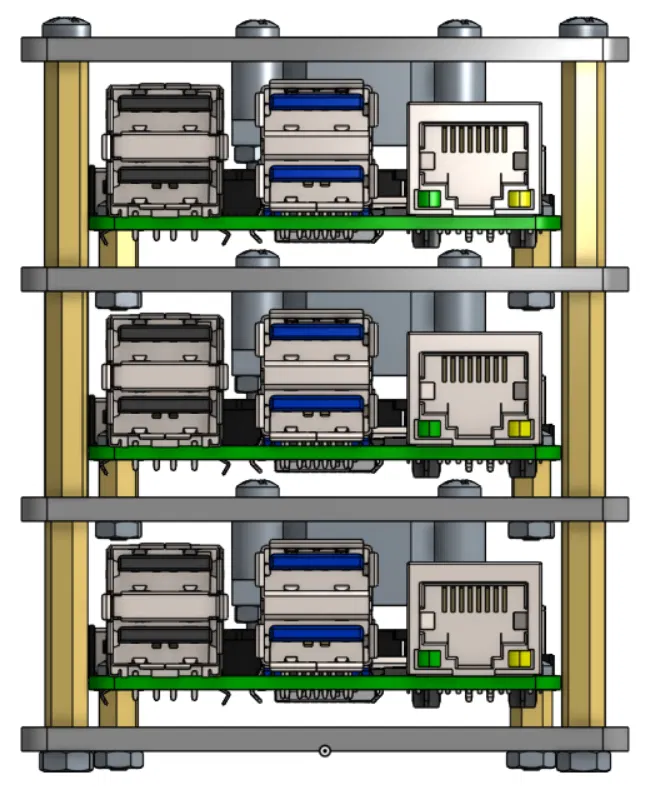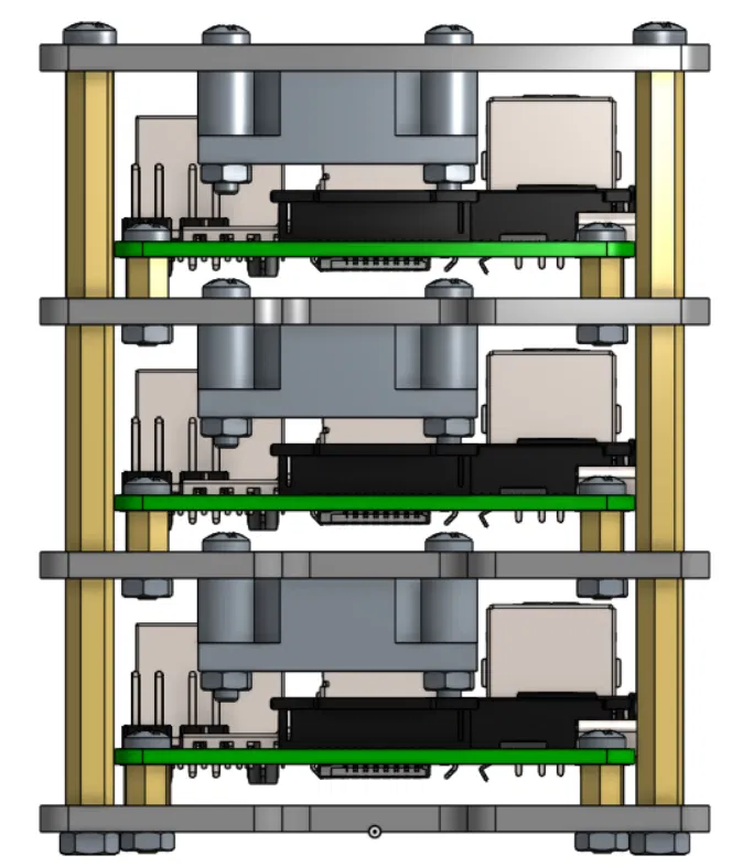 - Làm theo các bước của một Pi, thực hiện lặp lại cho mỗi tầng bằng cách lắp tấm giữa (Mid-Plate) với quạt và Pi tương tự như bước lắp tấm trên, sau đó xếp chồng lên nhau và siết chặt các trụ M3.