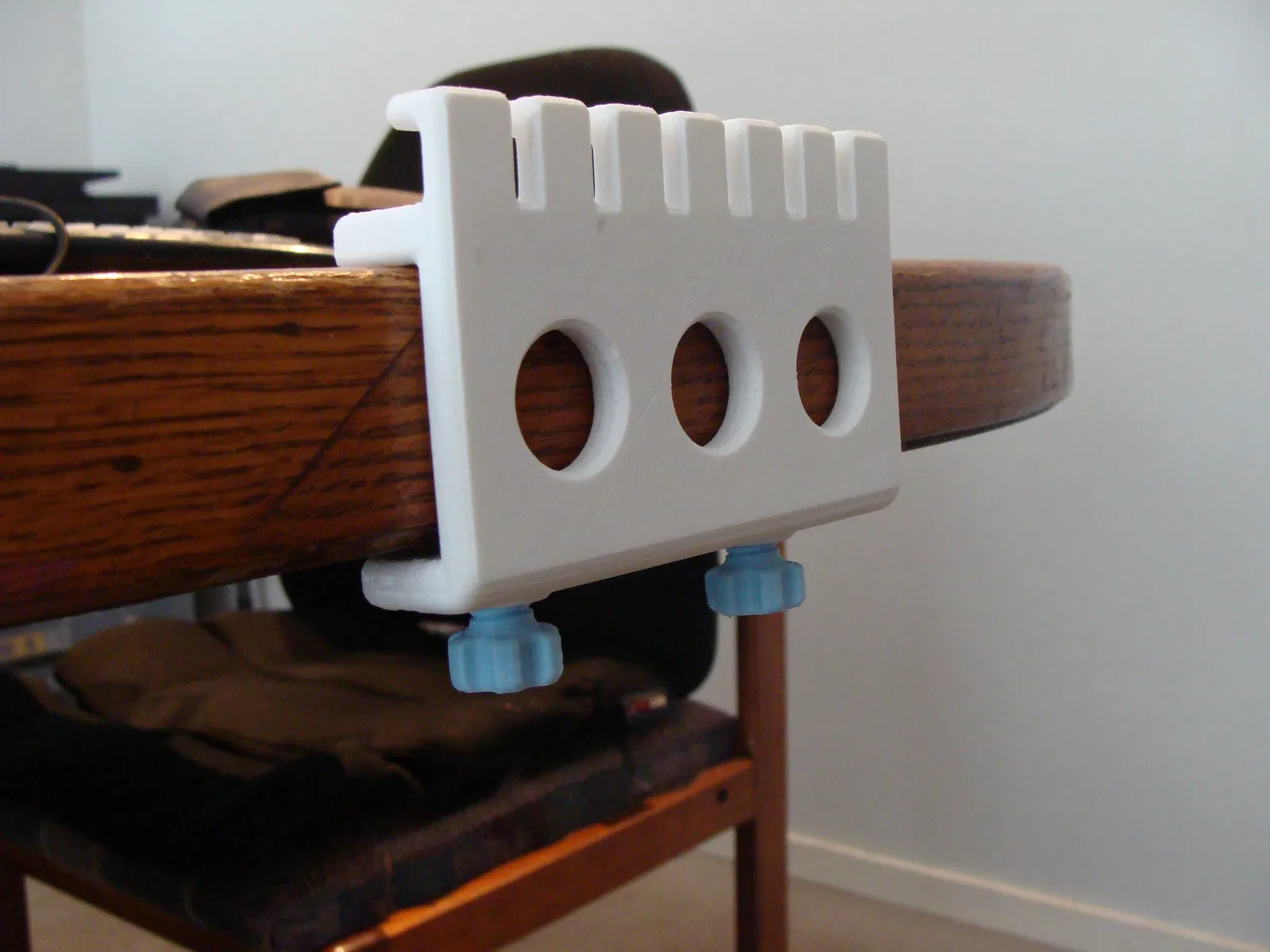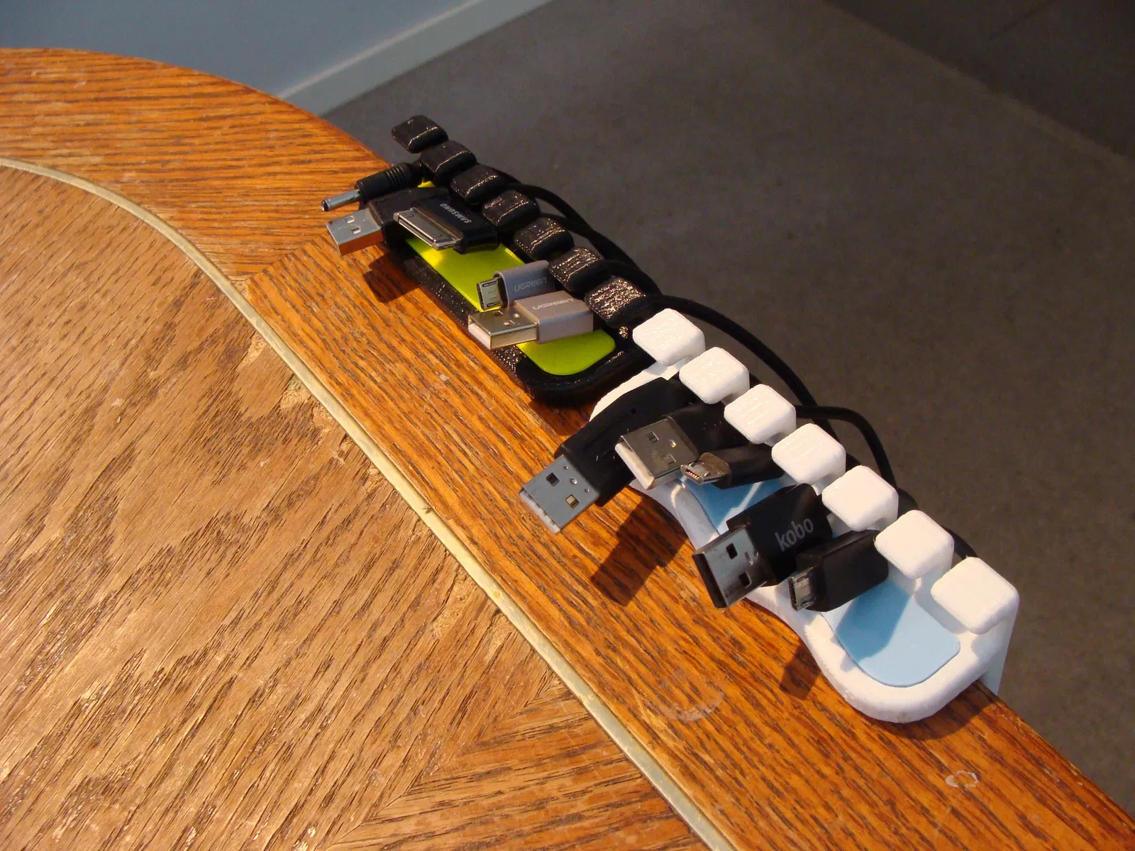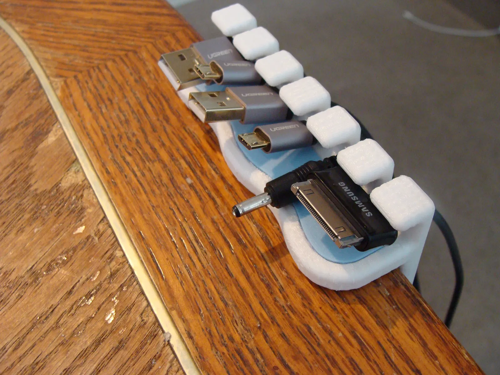 Mình thiết kế cái bộ sắp xếp cáp USB (USB cable organizer) này để có thể dễ dàng di chuyển khi cần thiết. Mình đã đính kèm 4 phiên bản khác nhau: dạng thẳng và dạng cong có kèm miếng chèn (insert) khớp nối, cùng với đó là dạng thẳng và dạng cong không kèm miếng chèn. Đây là lần đầu mình thử thiết kế một sản phẩm lắp ráp (snap together), và kết quả khá là ổn. Mọi người gặp vấn đề gì thì cứ cho mình biết nhé. Thiết kế này mình làm cho loại bàn có độ dày tiêu chuẩn 38mm (1 1/2 inch). Nếu bàn của bạn có độ dày khác, cứ nhắn kích thước cho mình, mình sẽ cố gắng hỗ trợ mọi người.