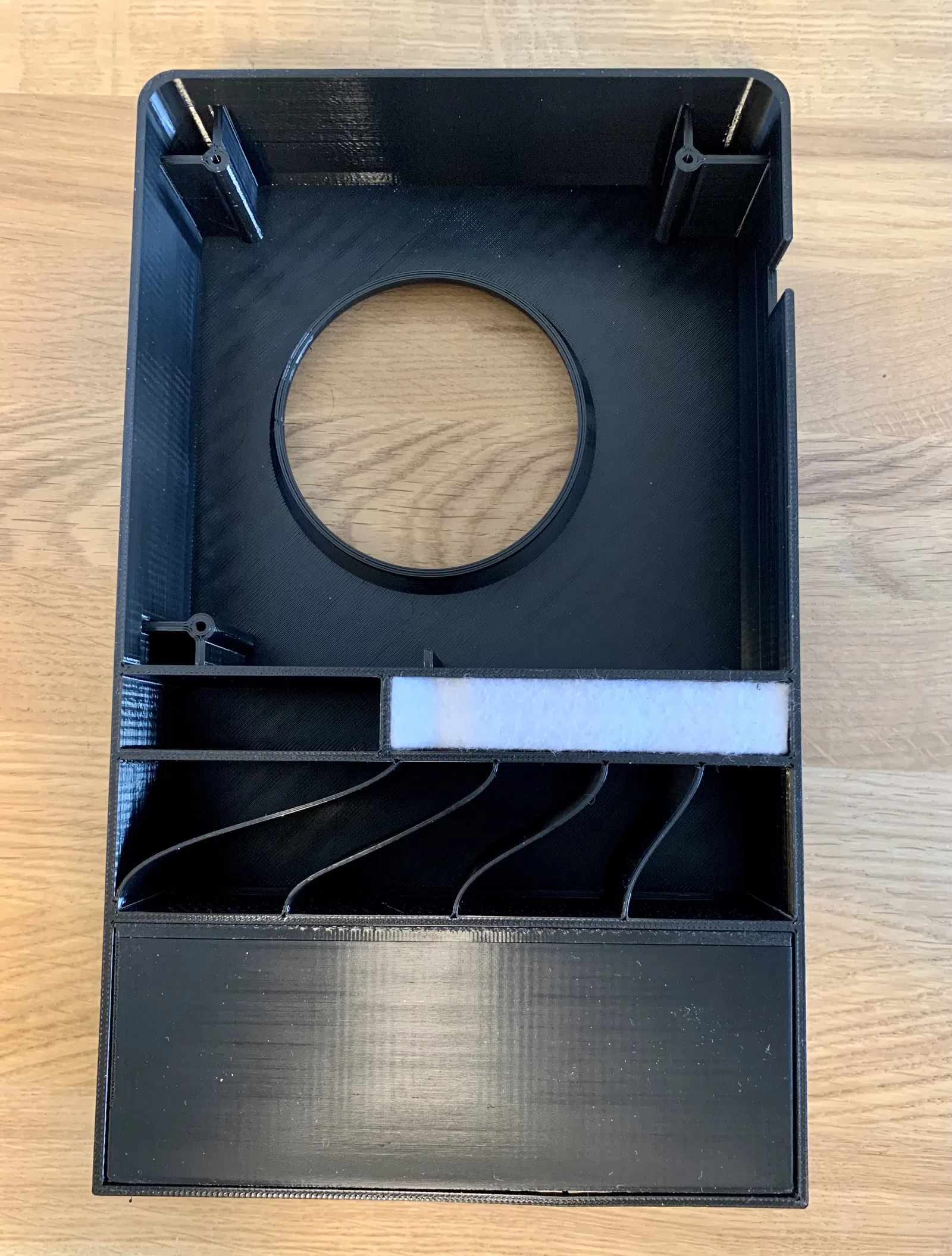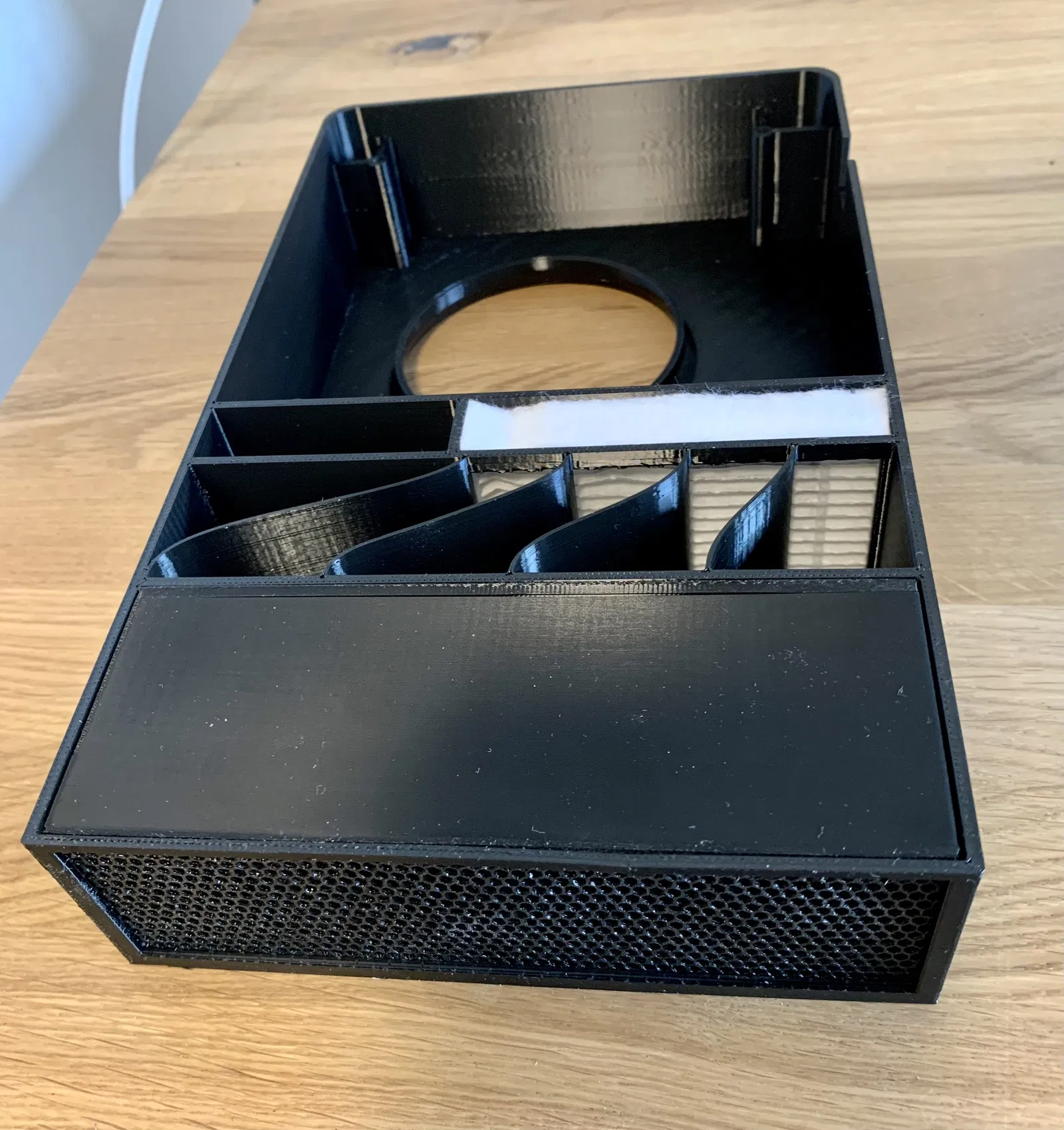 Bộ lọc HEPA: Thiết kế của bộ lọc này dựa trên kích thước lõi lọc HEPA từ máy hút bụi của mình (https://www.amazon.de/dp/B07K3TYGX3?ref=ppx_yo2ov_dt_b_product_details&th=1). Nếu bạn dùng loại khác, hãy đảm bảo nó vừa khít với vỏ máy (80 mm x 42 mm x 15 mm).