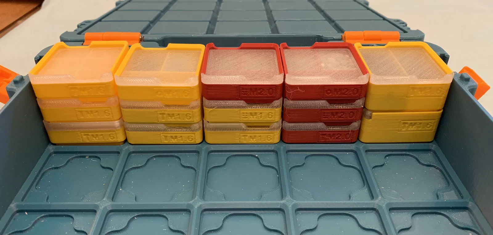 Đây là các khay Gridfinity có nắp đậy riêng biệt dùng để đựng ốc vít và linh kiện nhỏ. Mình bắt đầu làm dự án này để sắp xếp các loại ốc M1.6, M2.0 và M2.5 một cách gọn gàng. Trước đây việc tìm kiếm ốc vít cực kỳ phiền phức. Những linh kiện nhỏ này cần phải để trong từng hộp riêng có nắp đậy, nếu không thì sớm muộn gì chúng cũng bị trộn lẫn vào nhau, chưa kể đến tình huống lỡ tay làm rơi hộp xuống bàn làm việc thì rất mệt. Hồi trước mình có dùng túi zip để phân loại nhưng không tiện để lấy ra sử dụng.