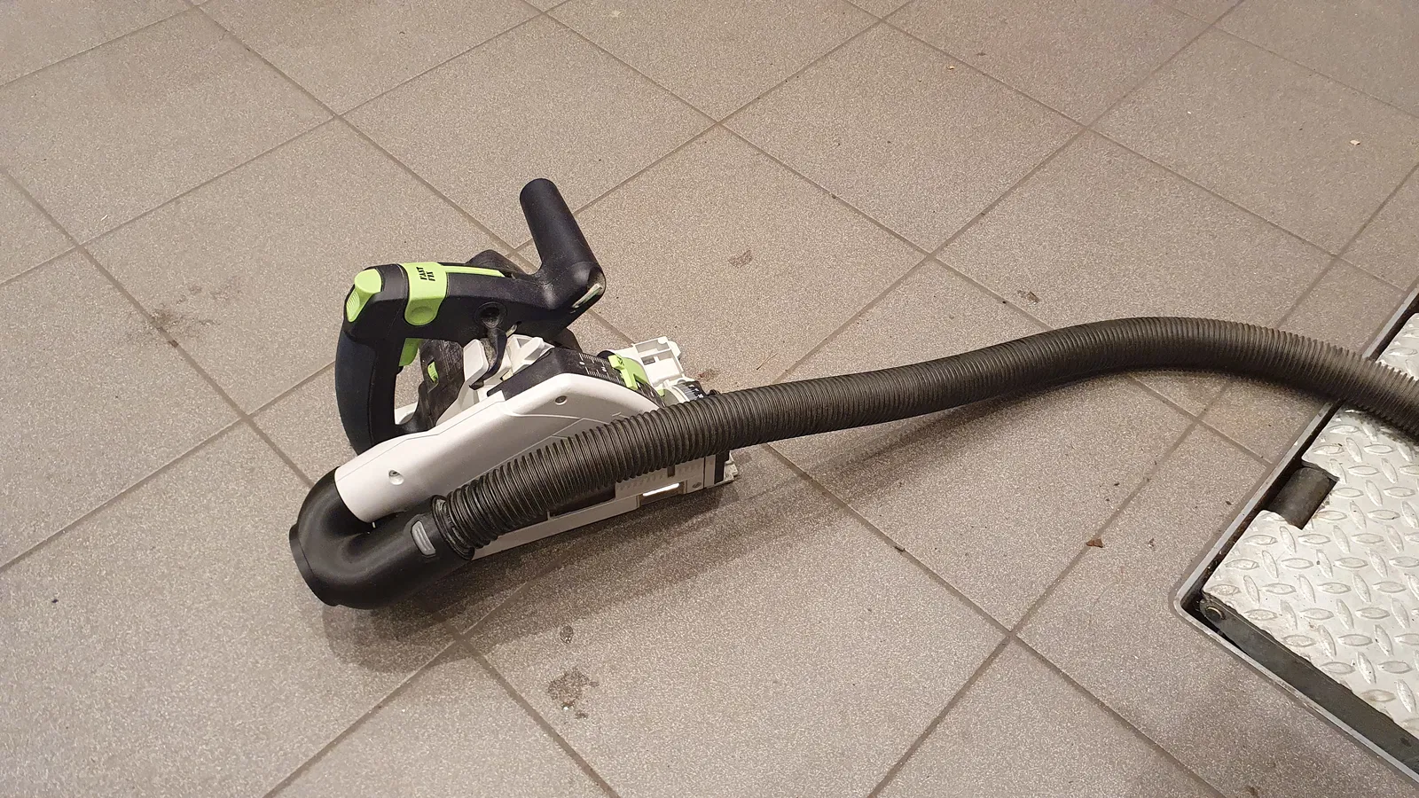 Tôi cảm thấy rất phiền khi ống hút bụi Kärcher của mình cứ bị kẹt vào vật liệu hoặc thanh ray khi đang cắt. Tôi nghĩ rằng việc để ống hút bụi hướng ra phía trước theo hình vòng cung thay vì kéo lê nó từ phía sau qua các cạnh sắc nhọn sẽ tốt hơn nhiều.