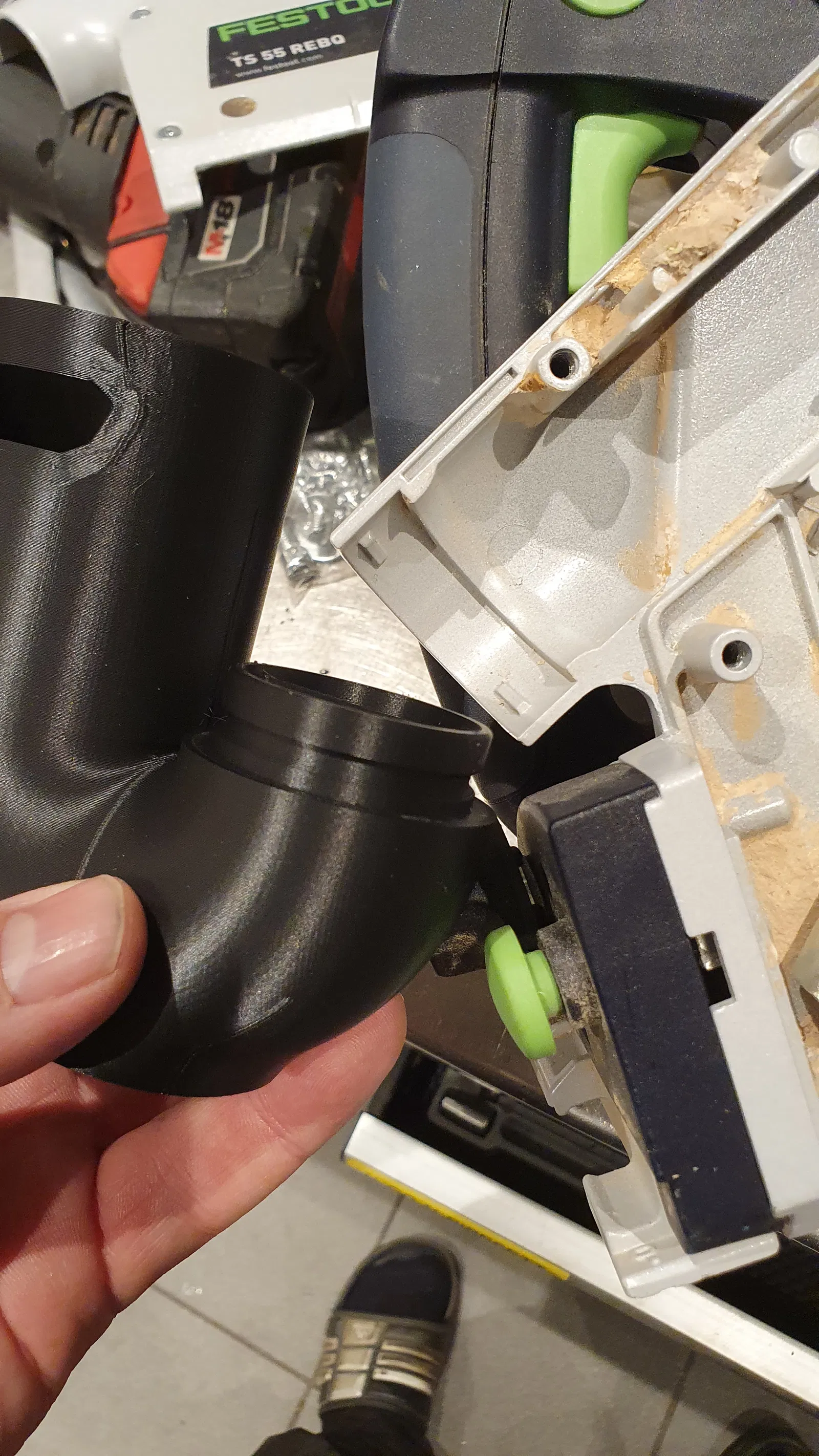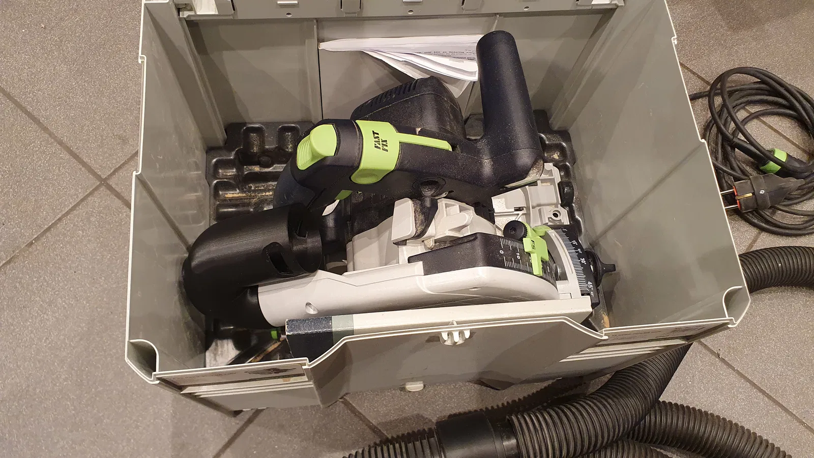 Giải pháp adapter xoay 180 độ giúp ống hút bụi Kärcher không bị vướng vào thanh ray hoặc vật liệu khi sử dụng với máy cưa đĩa Festool. Thiết kế tối ưu độ bền, dễ in và có thể bỏ gọn trong thùng Systainer mà không cần tháo rời.
