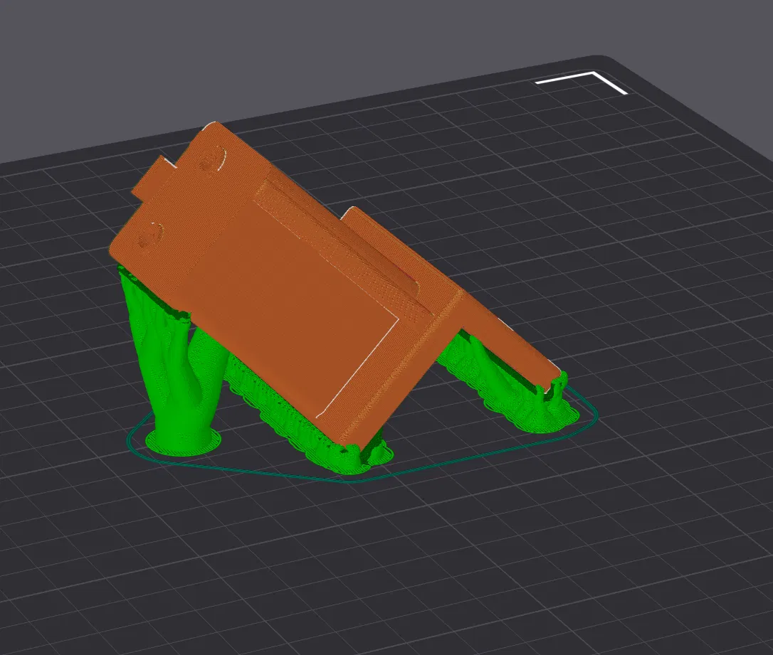 Các chi tiết đã được in và kiểm nghiệm thực tế trên chính chiếc SV06+ của mình bằng chất liệu PLA+. Mình khuyên bạn nên in phần tay đòn nghiêng 45 độ và có hỗ trợ (support) (xem hình minh họa), phần vỏ thì có thể in nằm phẳng. Mình dùng thông số 10% Cubic với 4 tường (walls) cho cả hai bộ phận và chúng đang hoạt động cực kỳ ổn định.