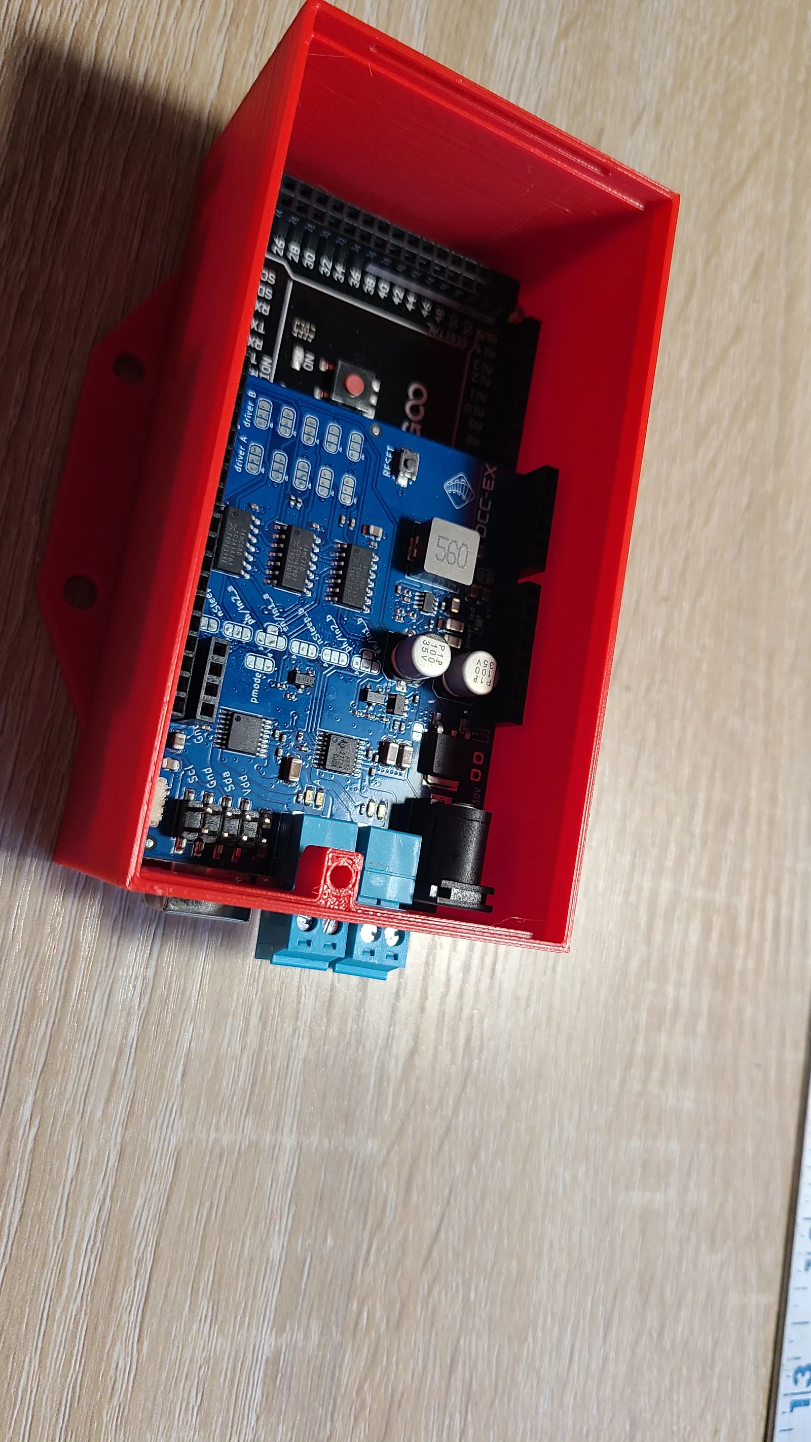 Mình rất thích mẫu case DCC-EX của bạn @Nebbish, nhưng nó lại không vừa với phần cứng của mình vì mình dùng EX-Motorshield8874 chứ không phải Arduino Motorshield. Mình đã điều chỉnh lại các cổng bên hông để khớp với bản 8874 này. Ngoài ra, mình thấy phần gắn vi điều khiển hơi lỏng lẻo nên đã thêm các trụ đỡ để bắt vít cố định ở phía sau. Bạn cần sử dụng ốc vít cỡ 2.5mm, chiều dài 6mm. Đây là loại ốc tiêu chuẩn mà chắc hẳn bạn nào có bộ standoff cũng đều có sẵn.