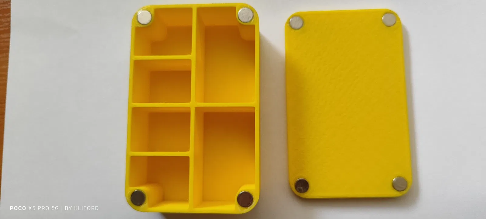 • Nam châm đi kèm: Bạn cần chuẩn bị 4 viên nam châm neodymium kích thước 8mm x 2mm để gắn vào các vị trí đã thiết kế sẵn trên hộp và nắp.