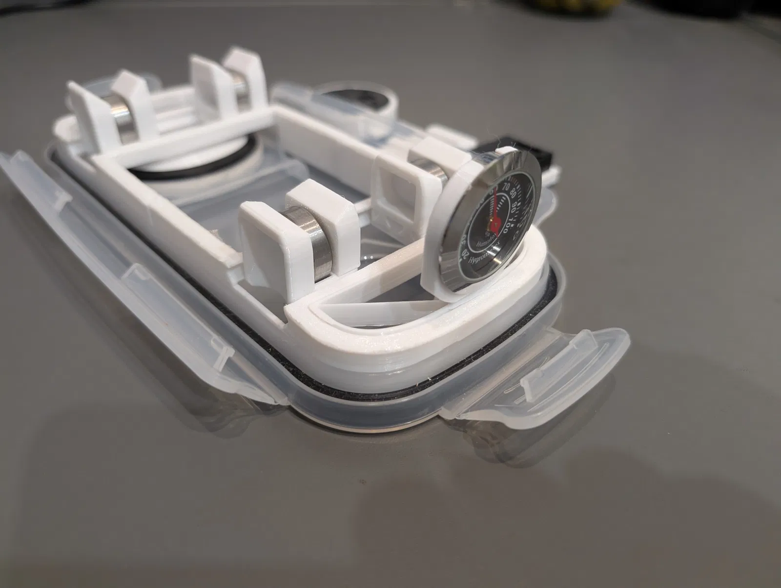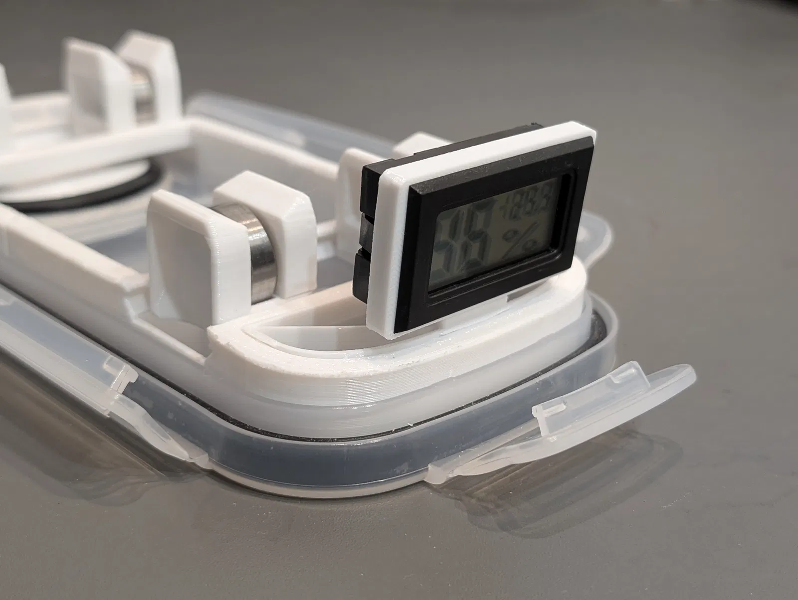 Phụ kiện đế gắn dạng module giúp bạn lắp đặt ẩm kế hoặc các vật dụng khác một cách chắc chắn bên trong hộp Ultimate Cereal Filament Drybox của GunplaMark, thay thế cho cách treo truyền thống không ổn định.