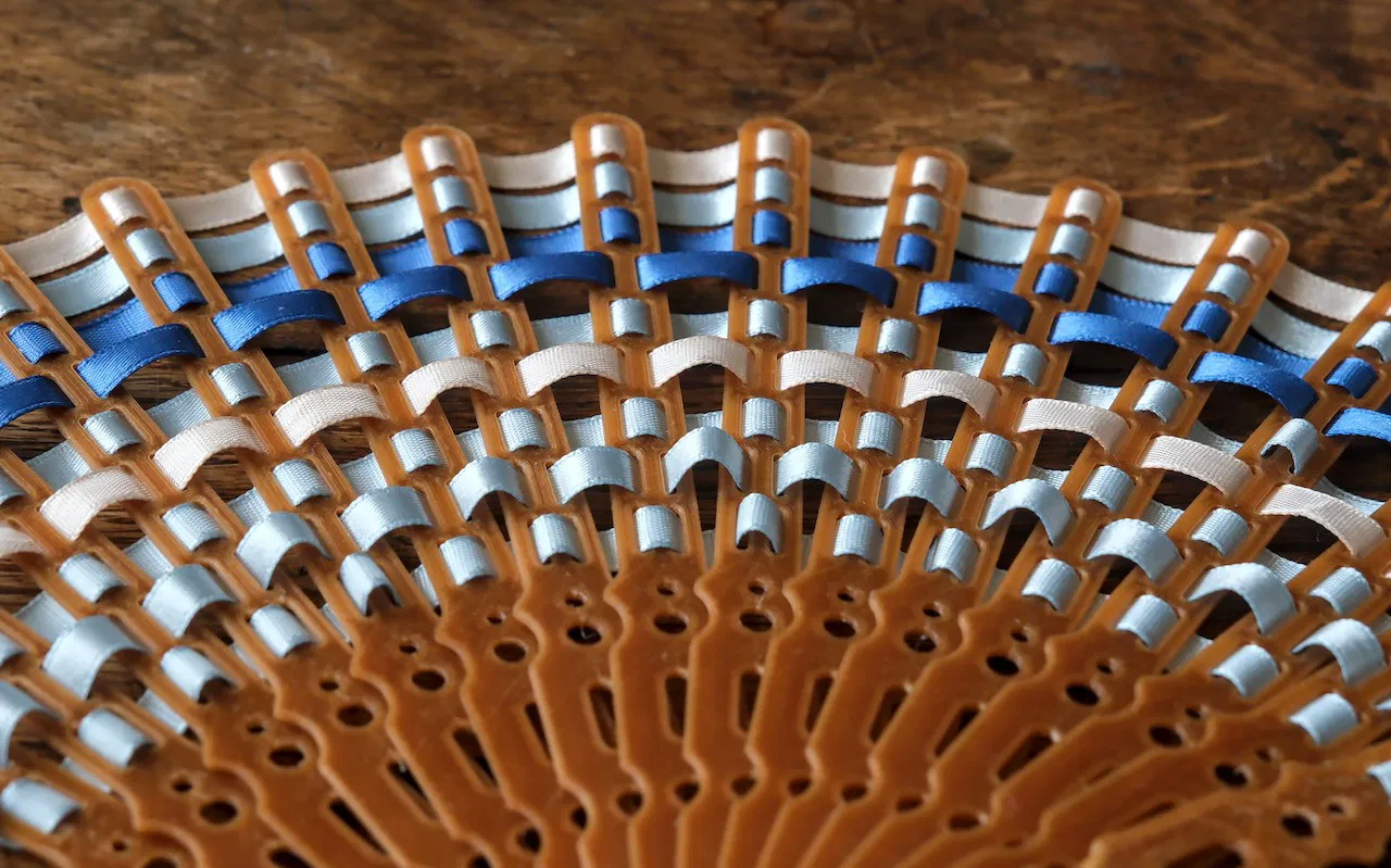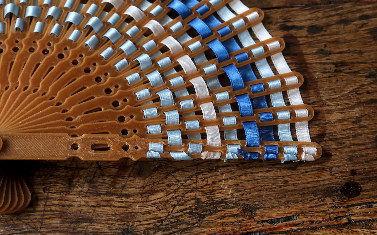 Thiết kế này bao gồm ba bộ phận in khác nhau và các dải ruy-băng để kết nối các cánh quạt. Cánh quạt có hai loại: loại có tất cả các lỗ 8mm, hoặc loại có hai lỗ 8mm và ba lỗ 16mm. Các lỗ 8mm được thiết kế để đan ruy-băng, còn lỗ 16mm dùng cho ruy-băng bản rộng hoặc các vật liệu đan khác. Mình đã dùng băng keo trang trí dán hai dải lại với nhau.