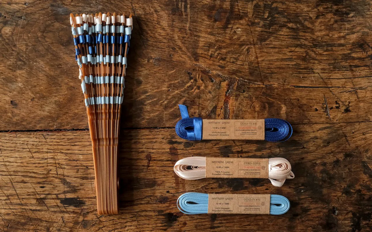 Để tạo kiểu đan, hãy bắt đầu với dải ruy-băng mềm rộng 8mm. Bắt đầu đan từ dưới lên trên.