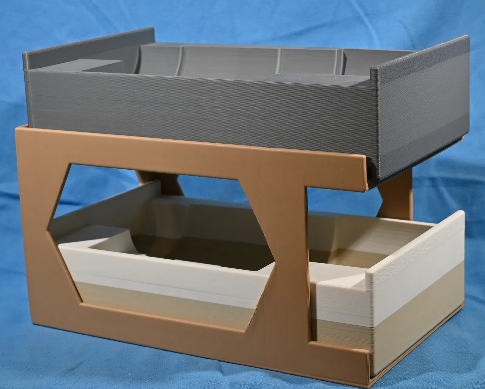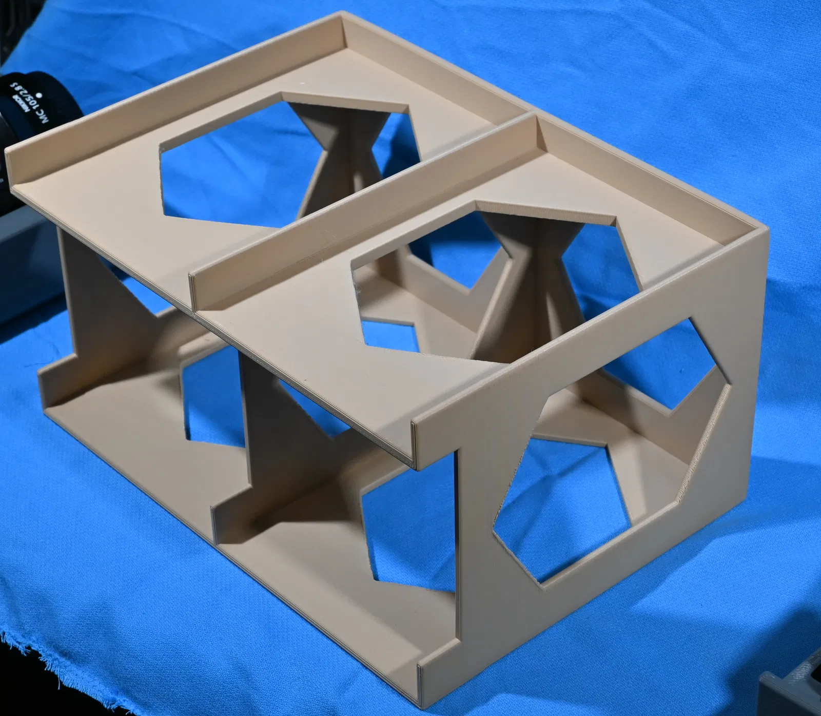 Mình không thích kiểu để ống kính Z-system thẳng đứng, còn cất trong túi đựng riêng hay vali ThinkTank photo thì vừa bất tiện lại chiếm quá nhiều diện tích. Vì vậy, mình đã đo đạc cẩn thận từng chiếc lens để thiết kế các ngăn kéo/khay đựng vừa vặn, sau đó in thêm giá đỡ để xếp gọn chúng vào kệ tủ đựng thiết bị nhiếp ảnh của mình. Bộ này gồm ba khay vừa và một khay dài: Khay vừa: z12-24_z24-40_drwr.stl -- dùng cho lens 14-24 f/2.8 S và 24-70 f/2.8 S (đời đầu) z105MC_drwt.stl -- dùng cho lens MC 105 f/2.8 S z28-400_drwr.stl -- dùng cho lens 24-400/4-8 Khay dài: z100-400_z70-200_drwr.stl -- dùng cho cả lens 70-200/2.8 S và 100-400 f/4.5-5.6, có chỗ để chân tripod (Lưu ý: mình vừa đổi hai chiếc này sang bản 70-200/2.8 S đời 2, nên không có trong hình, nhưng tháng trước thì vẫn dùng bình thường nhé!). Sau đó mình in thêm các giá đỡ để chồng được hai tầng. Các ngăn kéo in ở vị trí đáy úp xuống, giá đỡ in nằm ngang, không cần dùng support. Các khay vừa có thể in trên bàn in của Core One/MK4, nhưng khay dài thì mình in trên máy XL, và các giá đỡ thì quá khổ so với Core One/MK4. Tuy nhiên, bạn có thể cắt đôi giá đỡ vừa thành hai phần trái-phải để in trên Core One hoặc MK4 rồi dán lại là ổn. Tất cả đều được thiết kế bằng openSCAD, nếu bạn cần file gốc thì cứ nhắn mình nhé.