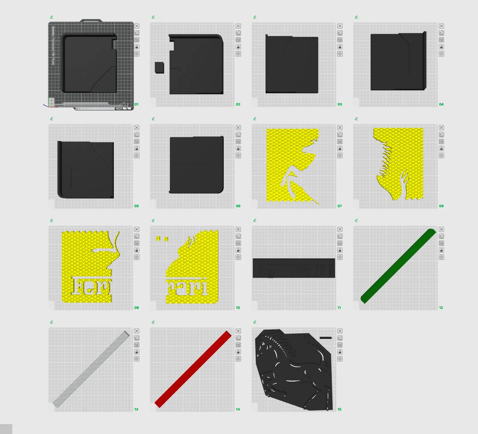 Điểm đặc biệt của mẫu thiết kế này là nó được tối ưu hóa để in bằng máy in 3D thông thường mà không cần đòi hỏi hệ thống AMS (Automatic Material System) phức tạp. Các bộ phận được chia tách rõ ràng, giúp bạn dễ dàng in từng phần với các màu sắc riêng biệt, sau đó chỉ cần ghép nối lại bằng keo dán chuyên dụng. Họa tiết nền tổ ong phía sau biểu tượng chú ngựa chồm giúp tạo thêm độ tinh tế và phong cách hiện đại, làm nổi bật lên hình ảnh thương hiệu vốn đã rất quen thuộc với giới mộ điệu xe hơi.