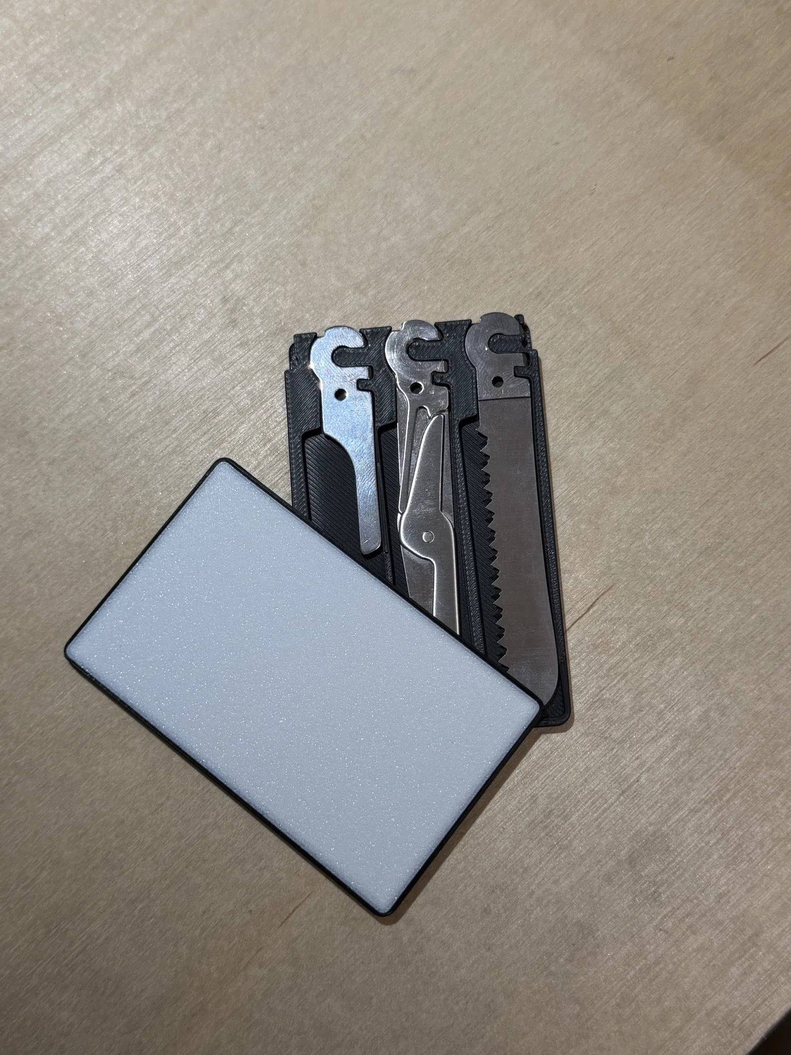 Nếu anh em đang sở hữu bộ dụng cụ Roxon Flex Card và muốn tìm cách sắp xếp chúng gọn gàng để mang theo bên mình mọi lúc mọi nơi, thì đây chính là giải pháp in 3D hoàn hảo. Mẫu thiết kế này được tạo ra với mục đích giữ chắc chắn 3 dụng cụ dài, mỏng trong một khung nhựa bền bỉ và tối giản. Với kích thước nhỏ gọn tương đương một chiếc thẻ, anh em hoàn toàn có thể nhét vừa vào ví, túi áo hoặc balo mà không chiếm quá nhiều không gian. Đây là món phụ kiện không thể thiếu cho những ai yêu thích sự ngăn nắp và tính tiện dụng của các công cụ đa năng.