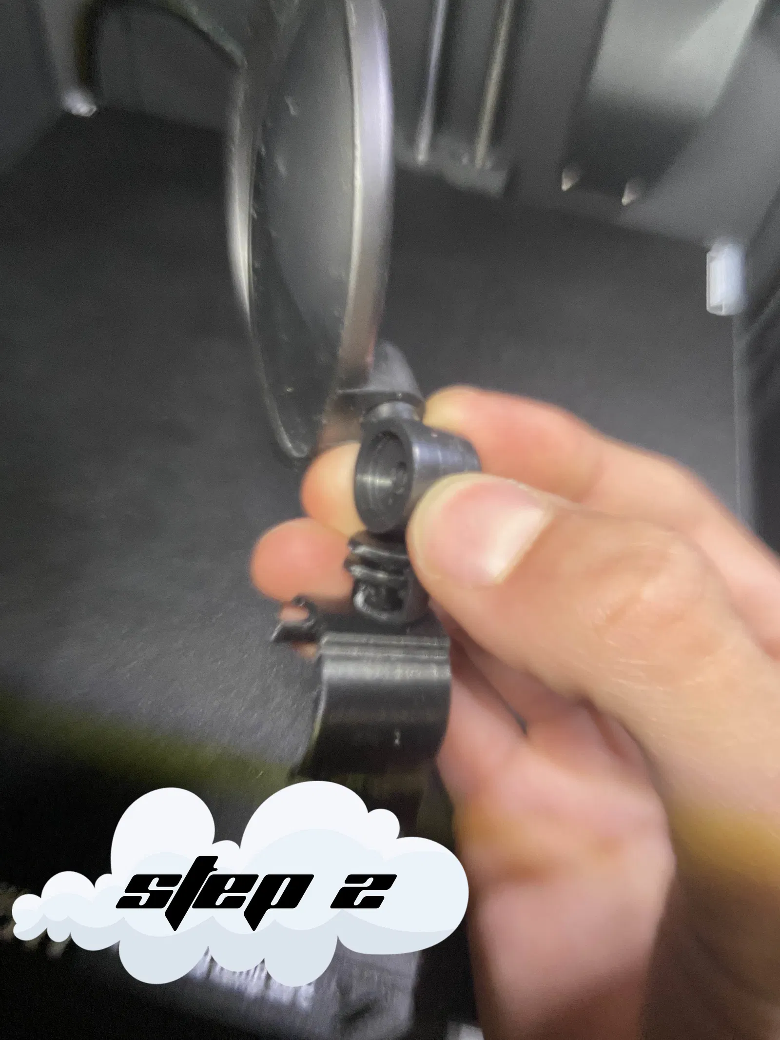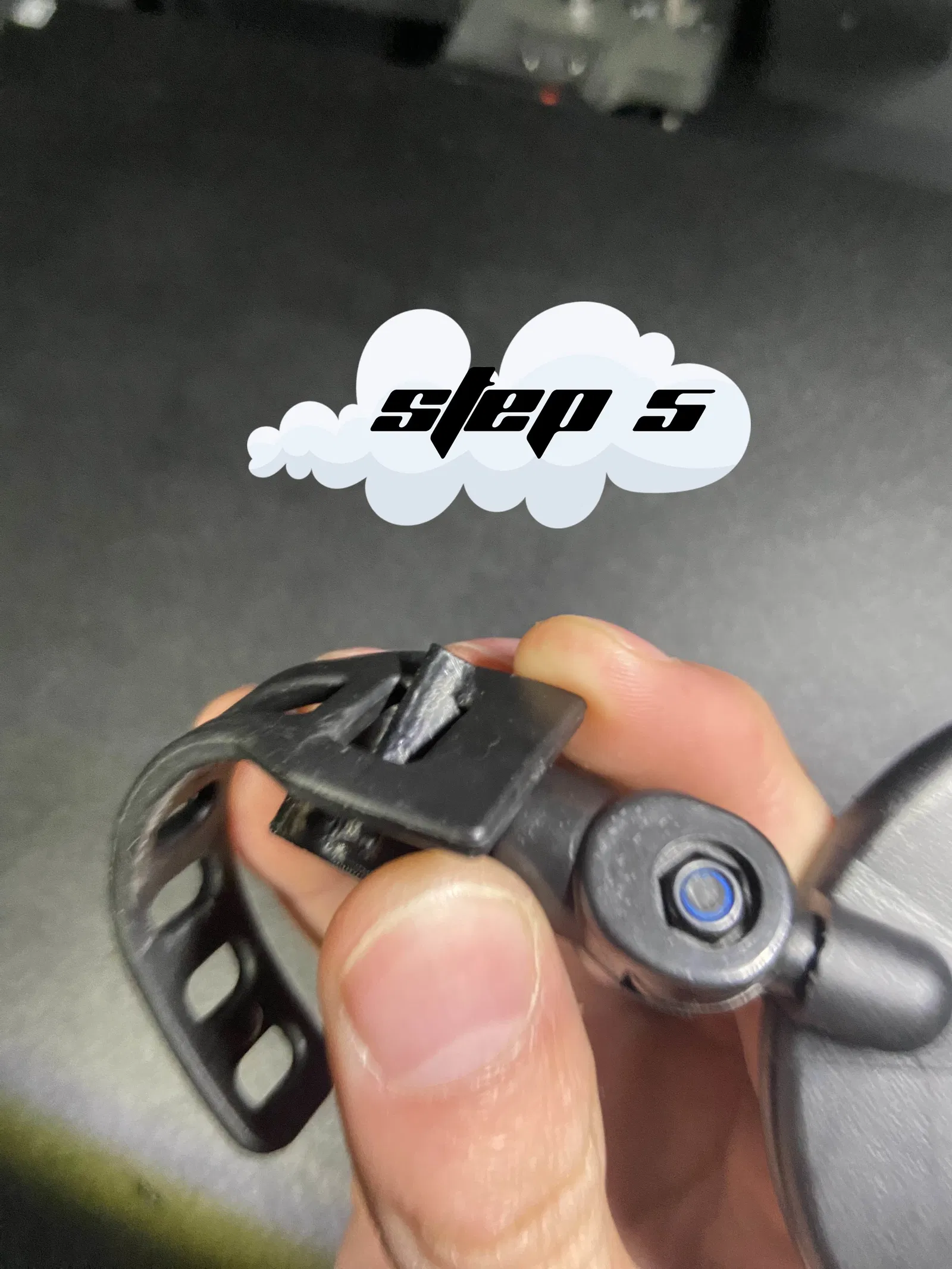 Lắp một bên kẹp vào ngàm vừa in. Đặt mặt gương vào ngàm rồi kẹp nó lại với bên còn lại. Siết ốc vào tán cho đến khi thật chặt. Luồn dây đai vào một trong hai chốt theo góc nghiêng. Cẩn thận lắp đầu dây đai còn lại vào chốt kia.