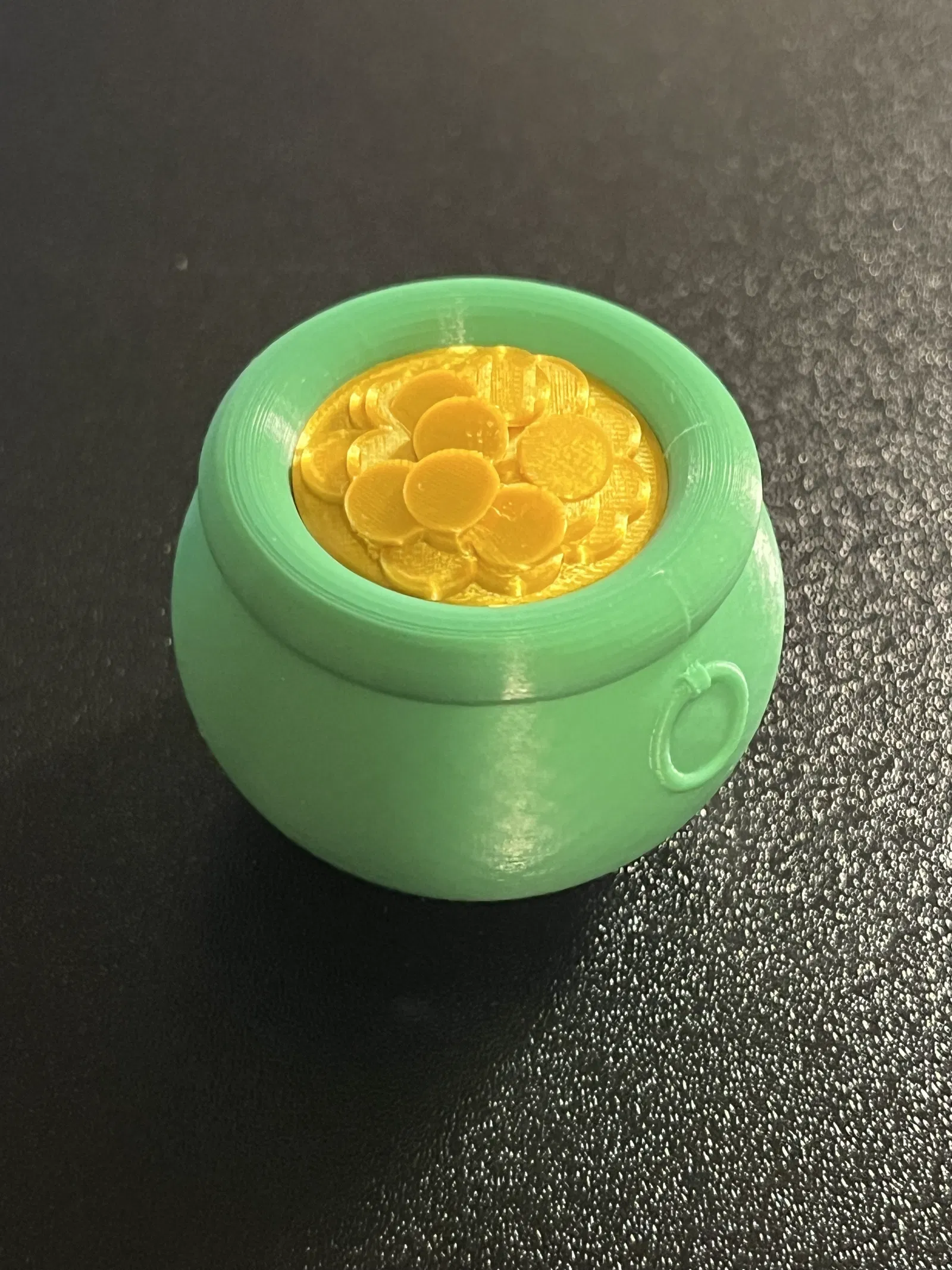 Một hũ vàng Pot o' gold đây! Bạn cần thu nhỏ file STL của hũ xuống còn 75% để vừa với phần vàng bên trong. File 3mf đã được thêm các chốt để giữ chặt hai phần với nhau. Tùy vào thiết lập máy in, có thể bạn sẽ cần chỉnh tính năng Elephant foot compensation. Các bộ phận có thể được kết hợp thành 1 file để in bằng MMU, nhưng mình thấy in riêng từng phần sẽ cho kết quả rất đẹp.