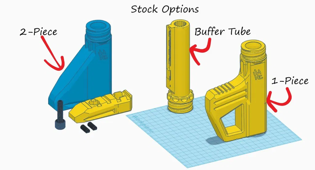 - Báng súng hai mảnh (2-piece stock - các mảnh trước sau cho phép phối nhiều màu hoặc dùng chất liệu TPU. Hãy in thêm ốc vít và 2 miếng spacer để cố định các phần lại với nhau!)