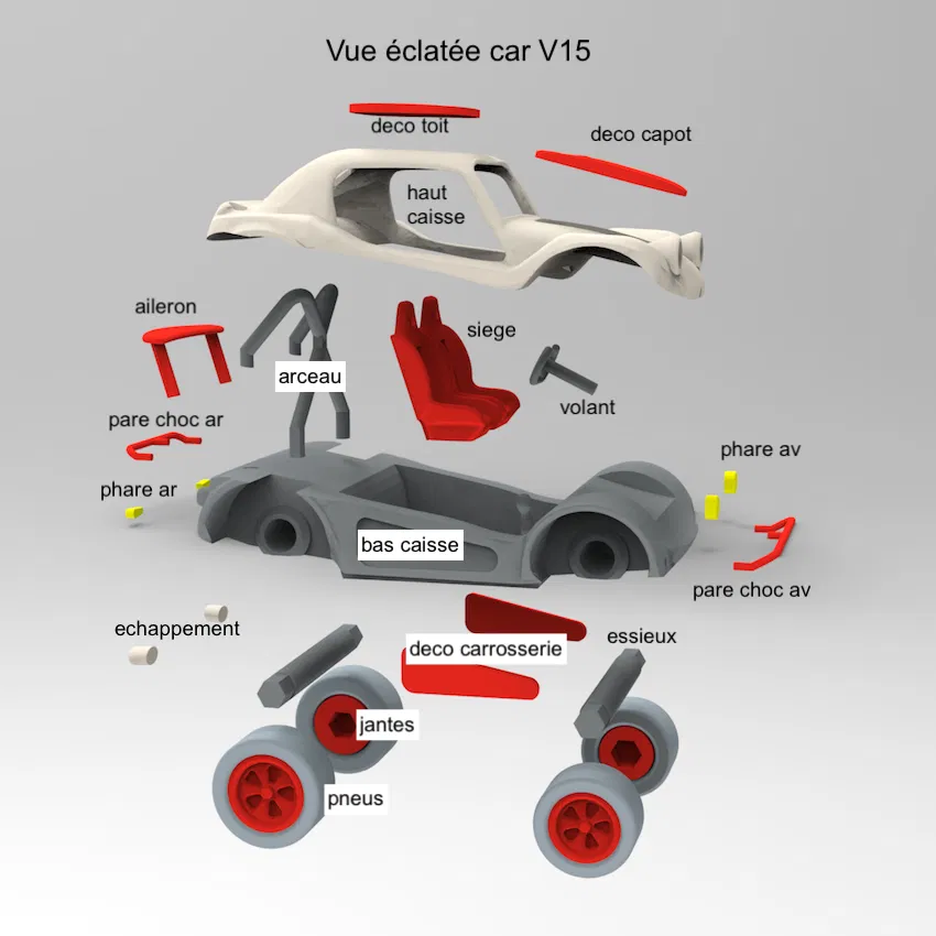 Mô hình Car V15 có kích thước tổng thể là 135mm x 79mm x 54mm, rất vừa vặn để đặt trên kệ sách, bàn máy tính hoặc làm quà tặng cho bạn bè. Điểm đặc biệt của thiết kế này là cấu trúc phân tách rõ ràng các bộ phận như bánh xe, ghế ngồi, cánh gió, cản trước sau và các phần ốp trang trí. Việc lắp ráp các mảnh in lại với nhau sau khi in xong chắc chắn sẽ mang đến cho bạn những giờ phút thư giãn tuyệt vời như đang lắp ráp một mô hình chuyên nghiệp.