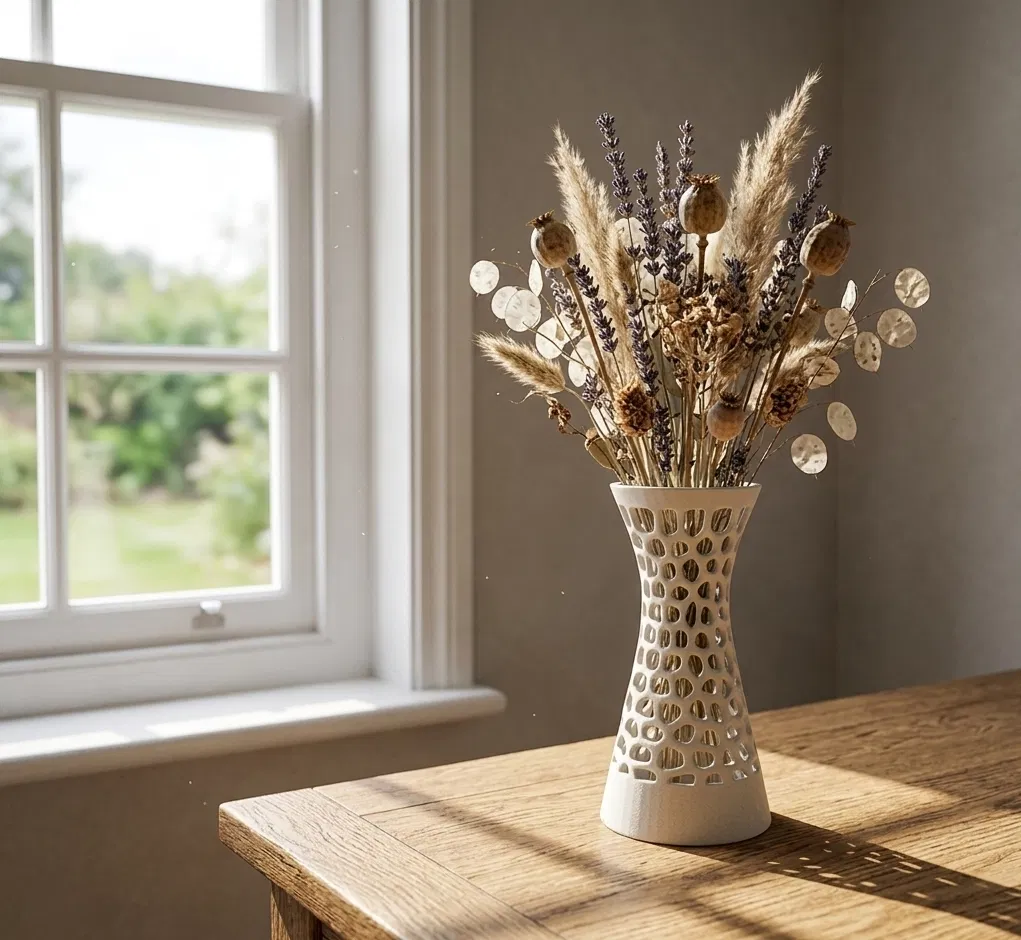 Mẫu bình hoa trang trí với họa tiết Voronoi độc đáo, phù hợp để cắm hoa khô. Bạn có thể dễ dàng điều chỉnh kích thước tùy theo nhu cầu, lưu ý nên để độ dày thành bình từ 2 mm trở lên để có kết quả in tốt nhất.