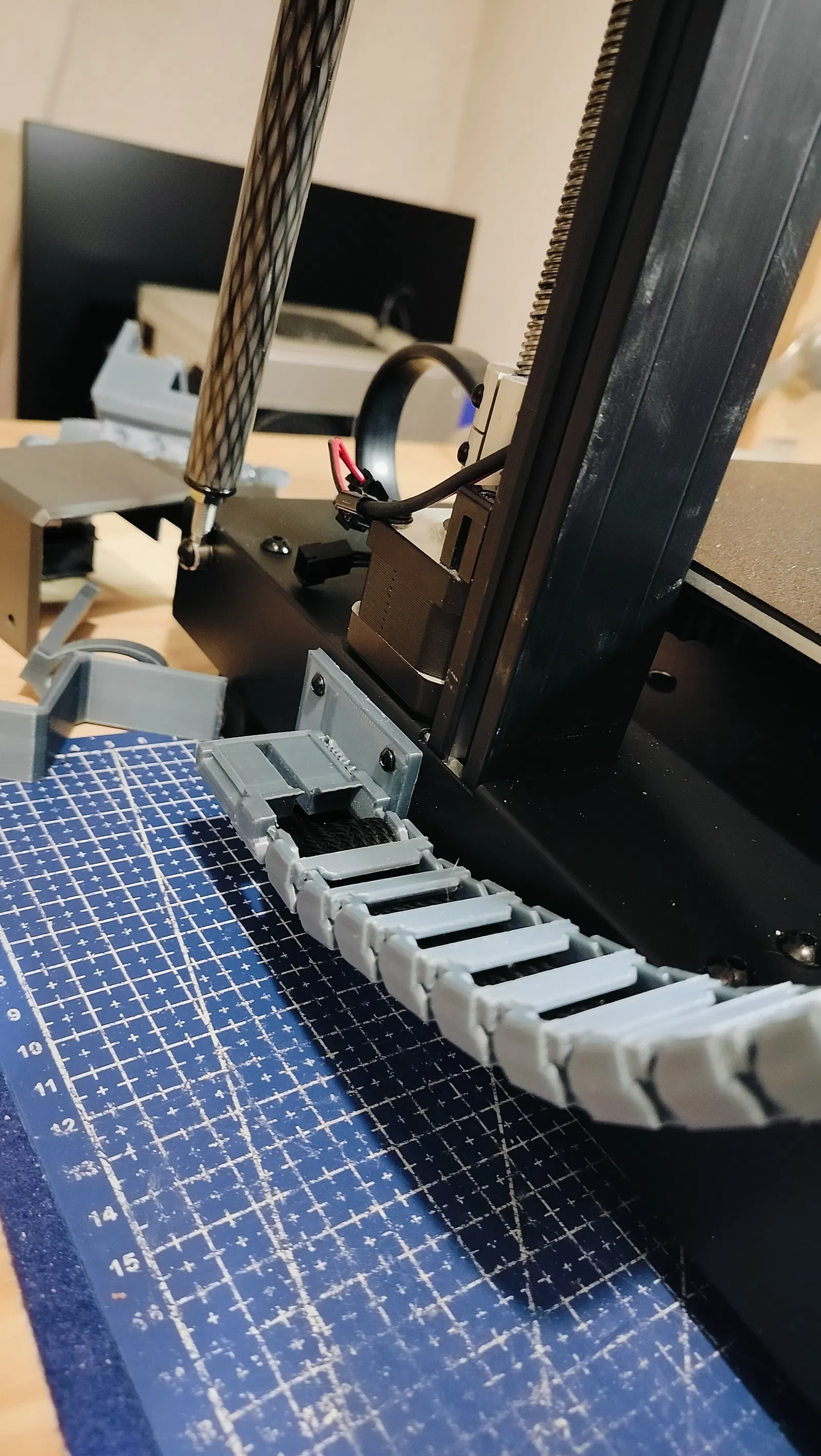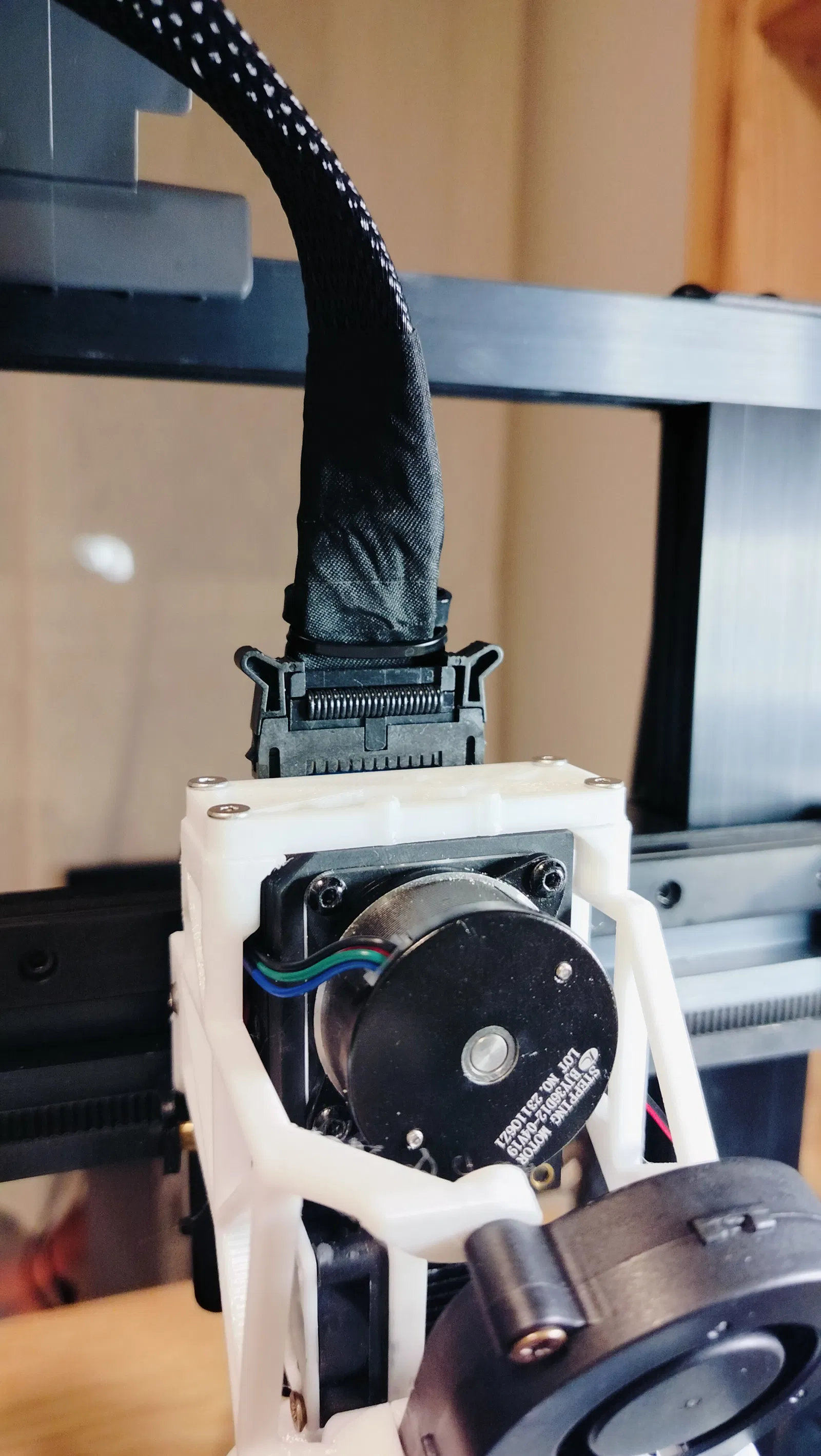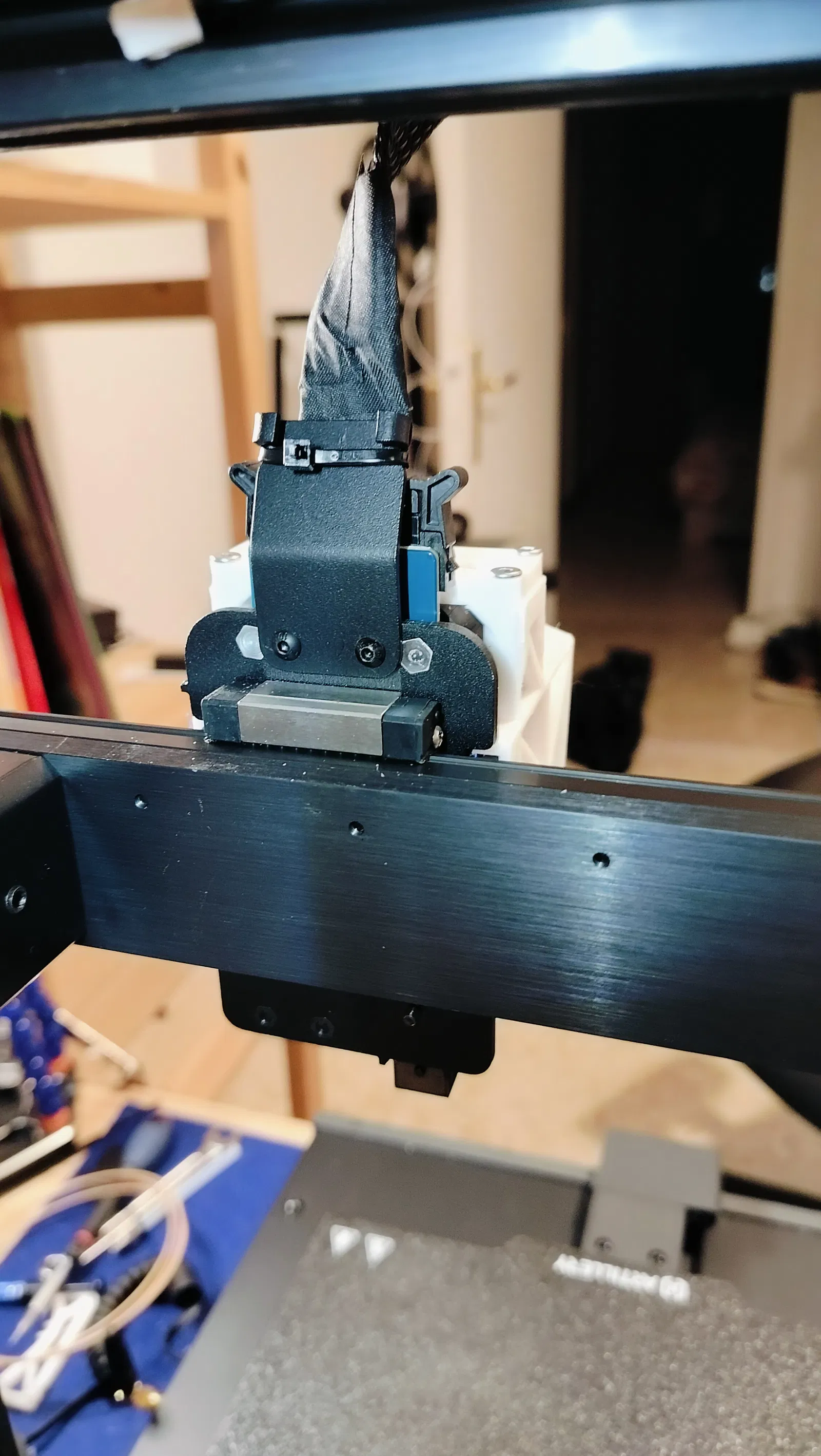 Bạn chỉ cần xoay nhẹ phần đỡ kim loại gốc trên đầu in rồi dùng dây rút (ziptie) cố định lại (nhớ quấn hai vòng băng keo ở vị trí dây rút tiếp xúc với cáp để bảo vệ).