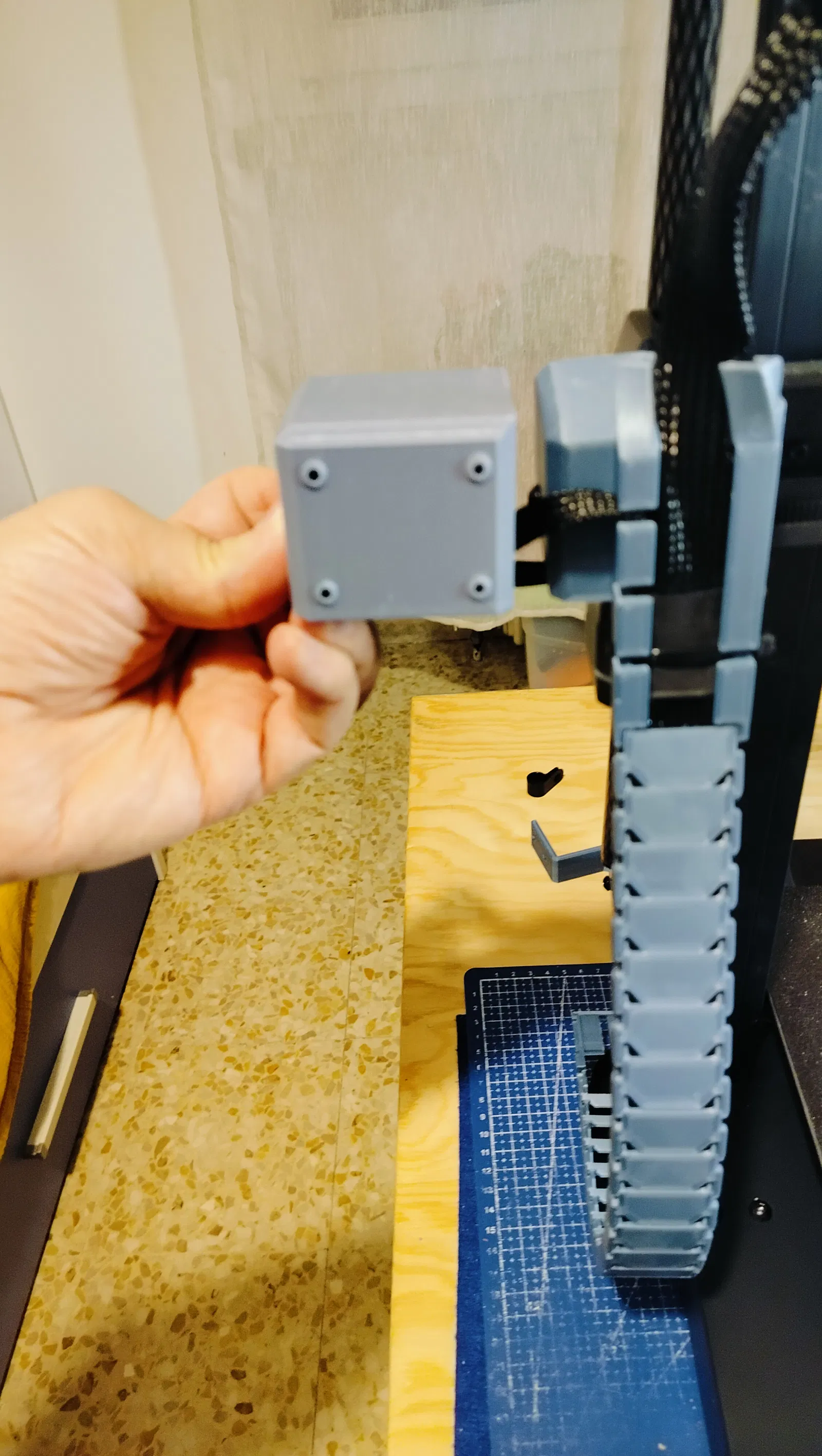 Với phiên bản không dùng xích, mình có thiết kế thêm nắp che động cơ trục X rút gọn với hai vòng khóa để in bằng nhựa TPU.