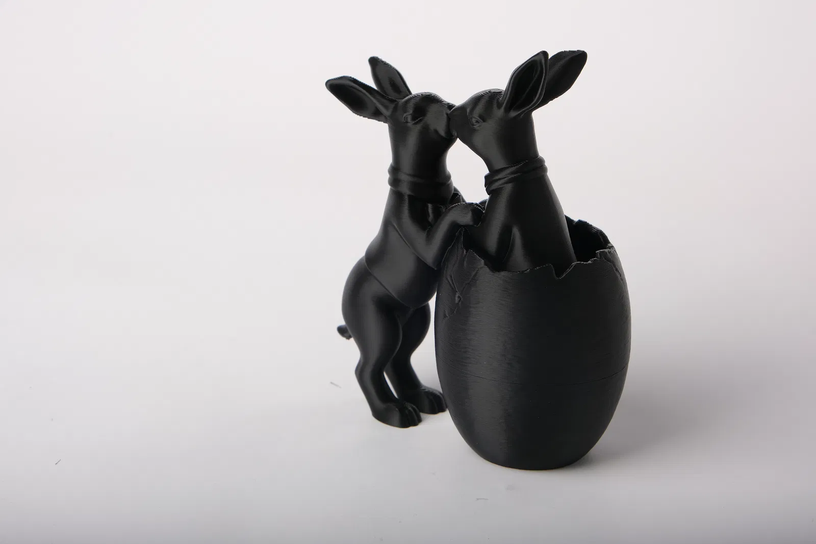 Mô hình nhỏ xinh này ghi lại khoảnh khắc ngọt ngào giữa hai chú thỏ. Một chú thỏ đang rướn người hôn, trong khi chú còn lại ngồi gọn trong vỏ trứng nứt. Thiết kế có phong cách tối giản, đường nét mượt mà cùng vẻ ngoài tinh nghịch, rất hợp để trang trí theo mùa. Mẫu thiết kế đơn giản nhưng đầy biểu cảm, tập trung vào hình dáng của hai nhân vật và chi tiết vết nứt trên vỏ trứng. Đây là món đồ trang trí dễ thương cho kệ sách hoặc lò sưởi, đặc biệt nếu bạn đang tìm kiếm thứ gì đó mới lạ cho góc trang trí Lễ Phục sinh của mình. Lớp hoàn thiện dạng lì (matte) như trong ảnh giúp làm nổi bật các tư thế và vết nứt nhỏ trên vỏ trứng.