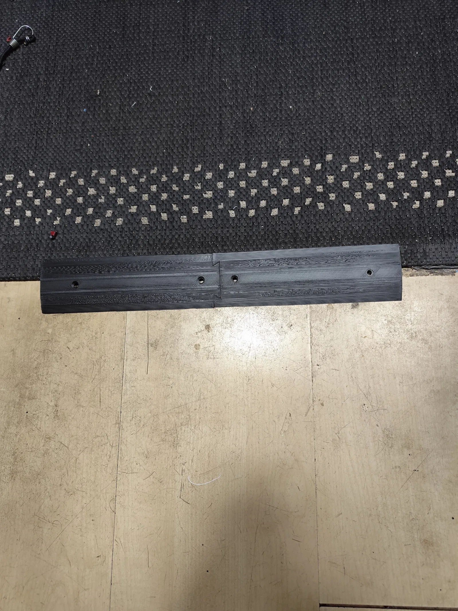 Khi tấm thảm của bạn cứ chạy lung tung khắp phòng hoặc làm khách đến nhà bị vấp ngã, thay vì phải "trừ tà", hãy thử dùng kẹp giữ thảm này xem sao... Ngoài ra, nó cũng rất hữu ích ở những chỗ nối thảm tại cửa ra vào. Tôi thiết kế chúng theo cặp vì chúng được khớp lại với nhau bằng một mối nối. Bàn in của tôi chỉ có 220mm, nên một cặp chỉ dài 400mm, không đủ cho một ô cửa. Do đó, bạn hãy đo ô cửa của mình và scale thêm một cặp kẹp nữa cho vừa với phần còn dư. Nếu bạn giữ nguyên chiều rộng và chiều cao, bạn có thể tùy chỉnh chiều dài cho phù hợp. Vấn đề duy nhất là việc này sẽ làm biến dạng các lỗ khoan một chút, nhưng vì bạn cũng phải khoan xuống sàn nên có thể khoan lại các lỗ đó cùng lúc. Đường kính lỗ là 5mm.