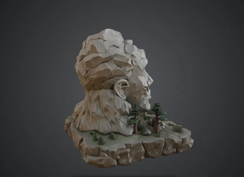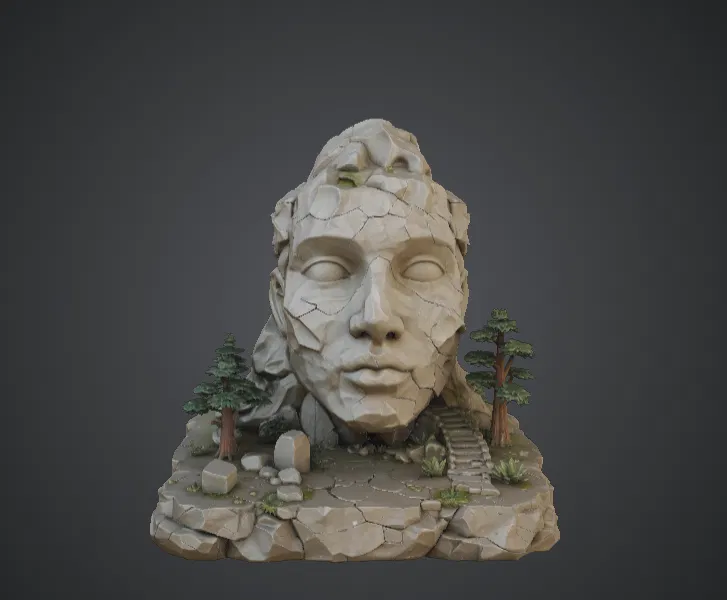 Mô hình Ancient Stone Face Monument tái hiện khuôn mặt khổng lồ của một bức tượng cổ xưa nằm giữa cảnh quan hoang tàn, với những chi tiết nứt vỡ chân thực gợi lên vẻ đẹp của một nền văn minh đã bị thời gian vùi lấp trong rừng già.