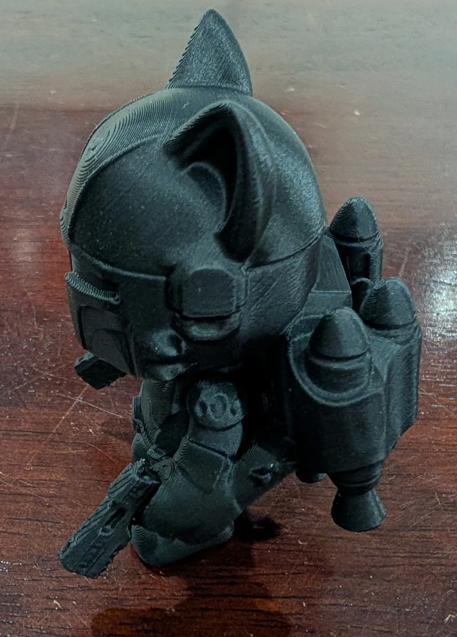 Thiết kế của mô hình tập trung vào phong cách "chibi" nhưng vẫn giữ được vẻ gai góc của một thợ săn tiền thưởng thiện chiến. Những đường nét trên mũ bảo hiểm, bộ giáp và đôi tai sói đặc trưng tạo nên một vẻ ngoài cực kỳ lôi cuốn. Bạn có thể in mô hình này bằng chất liệu PLA Matte để tạo cảm giác sang trọng, cứng cáp, làm nổi bật các chi tiết bề mặt mà không bị bóng quá mức dưới ánh đèn.