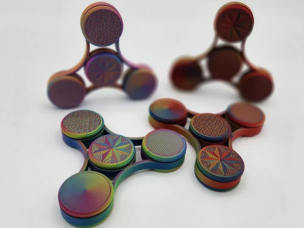 Việc tự tay in ấn chiếc Fidget Spinner này cực kỳ đơn giản, phù hợp cho cả những người mới bắt đầu với công nghệ in 3D. Để đạt được vẻ ngoài rực rỡ và cuốn hút nhất như trong hình, bạn nên ưu tiên sử dụng nhựa in filament đổi màu (dual hoặc tri-color filament). Khi in với các loại nhựa này, màu sắc sẽ biến đổi liên tục, tạo nên sự chuyển động màu sắc đầy ma thuật mỗi khi bạn cho spinner xoay tròn.