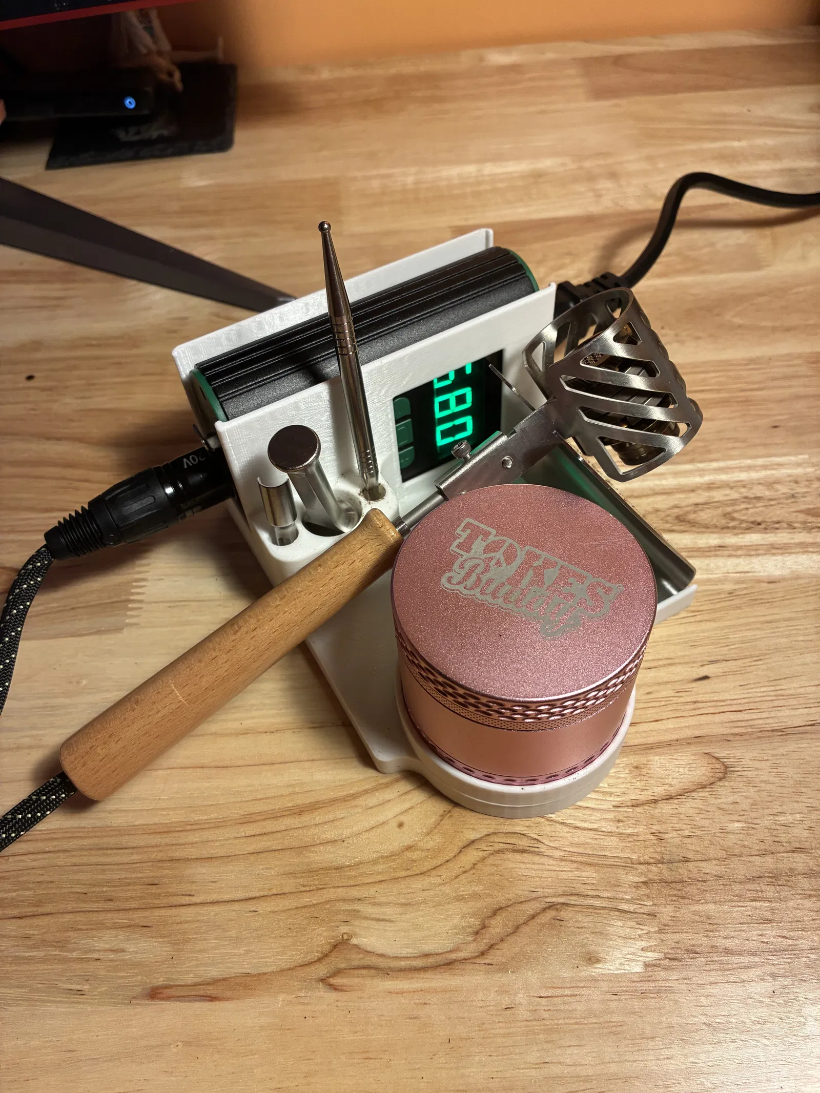 Mẫu này vừa vặn với bộ PID, đế và tay cầm (wand) tiêu chuẩn của Ruby Twist (bất kể loại tay cầm nào, mình đã nâng cấp lên loại gỗ). 3 lỗ cắm dụng cụ được thiết kế riêng cho các loại dab tool, muỗng múc và muỗng mini của Crossing Tech. Đường kính lỗ để máy xay là 63mm.