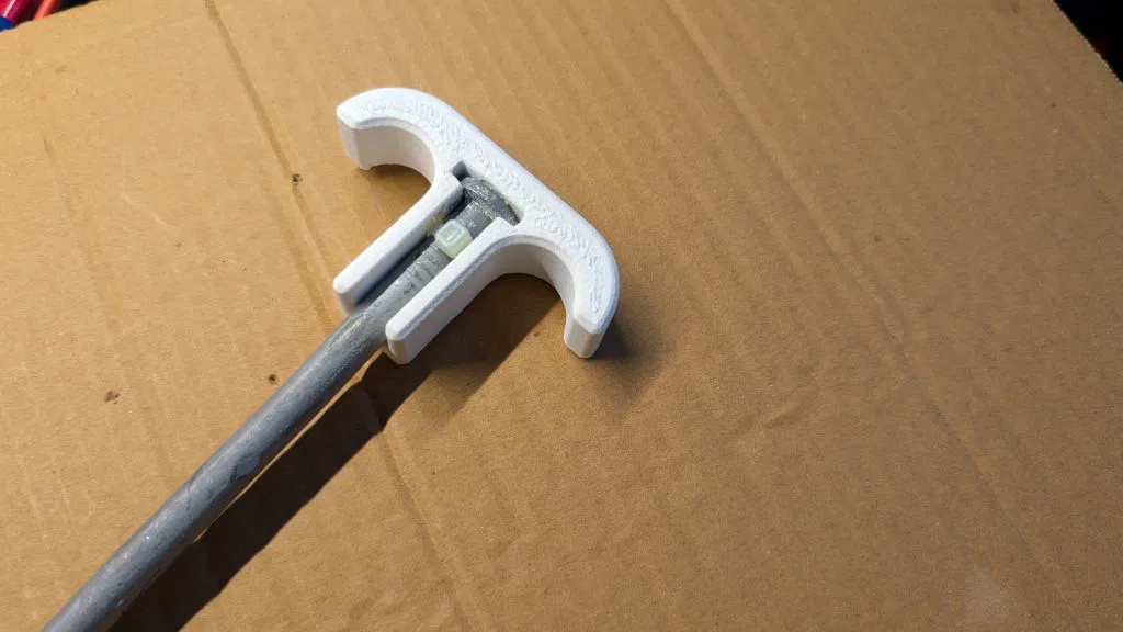 Phần cọc sẽ khớp vào rãnh được thiết kế ở bên cạnh mô hình và cố định bằng dây rút (zip tie). Mình đã thử dùng loại dây rút 1/8" (3.17mm) và 3/16" (4.75mm). Các khe hở này có thể vừa với dây rút tối đa 5mm. Độ khít của rãnh giúp bạn có thể đóng đinh bằng búa hoặc nhấn bằng tay thoải mái. Nó cũng giúp việc rút cọc lên bằng tay hoặc cột dây dễ dàng hơn, phần đầu còn có thể dùng để giữ dây khi cần chằng buộc.