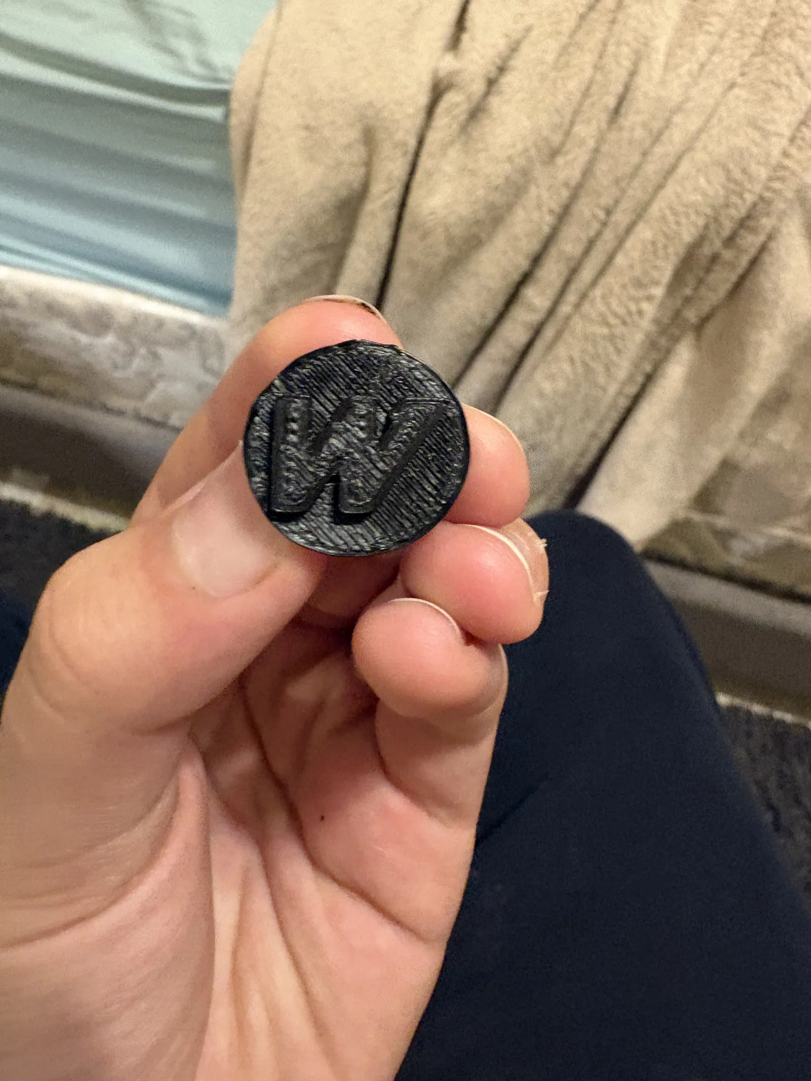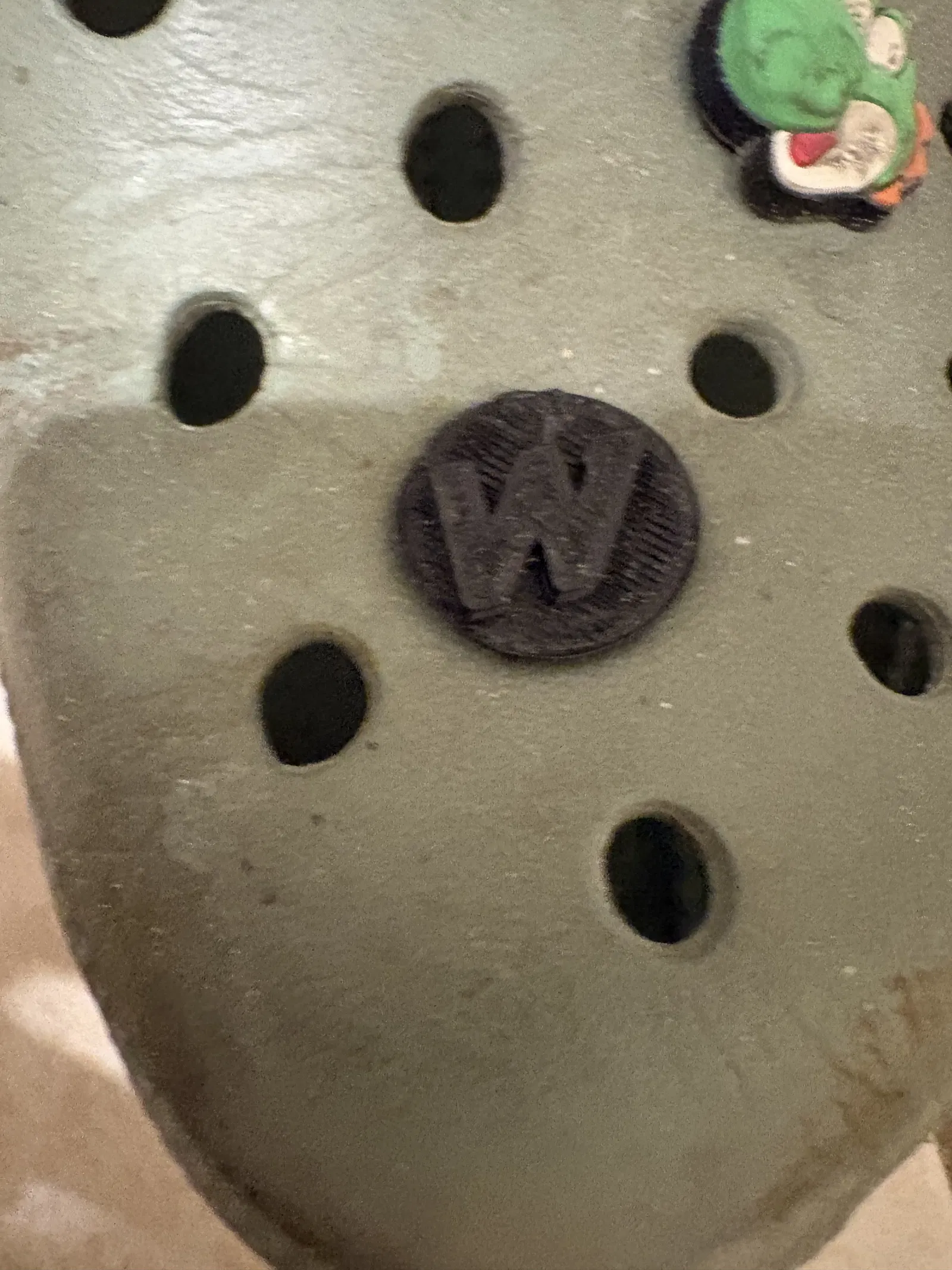 Sản phẩm có kích thước vừa vặn, được tối ưu hóa để gắn chặt vào các lỗ thoáng khí trên dép Croc một cách dễ dàng và chắc chắn. Thiết kế hình tròn nhỏ gọn với logo chữ "W" cách điệu nổi bật, tạo điểm nhấn đầy tinh tế mà không gây vướng víu khi mang. Bạn có thể in bằng nhựa PLA với tông màu đen truyền thống như trong ảnh, hoặc thỏa sức sáng tạo với các loại nhựa có màu sắc nổi bật hơn như xanh dương hoặc trắng đặc trưng của đội Williams để tăng thêm sự ấn tượng cho phong cách cá nhân.