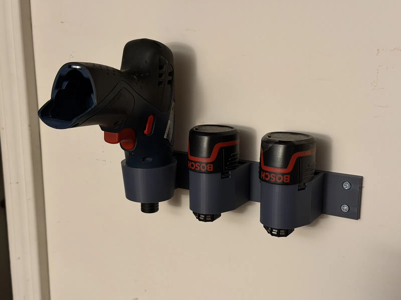 Nếu bạn đang sở hữu chiếc máy khoan Bosch PS20 dòng 10.8V và cảm thấy khó chịu vì bàn làm việc luôn bừa bộn với máy và pin rời, thì đây chính là giải pháp dành cho bạn. Giá treo tường được thiết kế chuyên biệt để giữ chặt chiếc máy khoan cùng với hai viên pin đi kèm một cách gọn gàng và khoa học. Thay vì vứt lung tung trên bàn, giờ đây bạn có thể gắn cố định chúng lên tường hoặc cạnh bàn làm việc, giúp không gian trở nên ngăn nắp và chuyên nghiệp hơn hẳn.