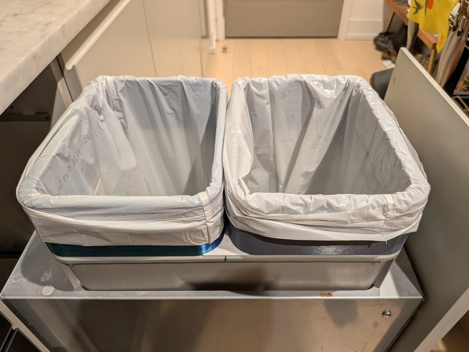 Giải pháp thông minh giúp bạn treo cả túi rác thường và túi rác tái chế trong cùng một chiếc thùng rác trong tủ bếp. Thiết kế tiện lợi, dễ in ấn và cực kỳ hữu ích cho việc phân loại rác tại nhà.