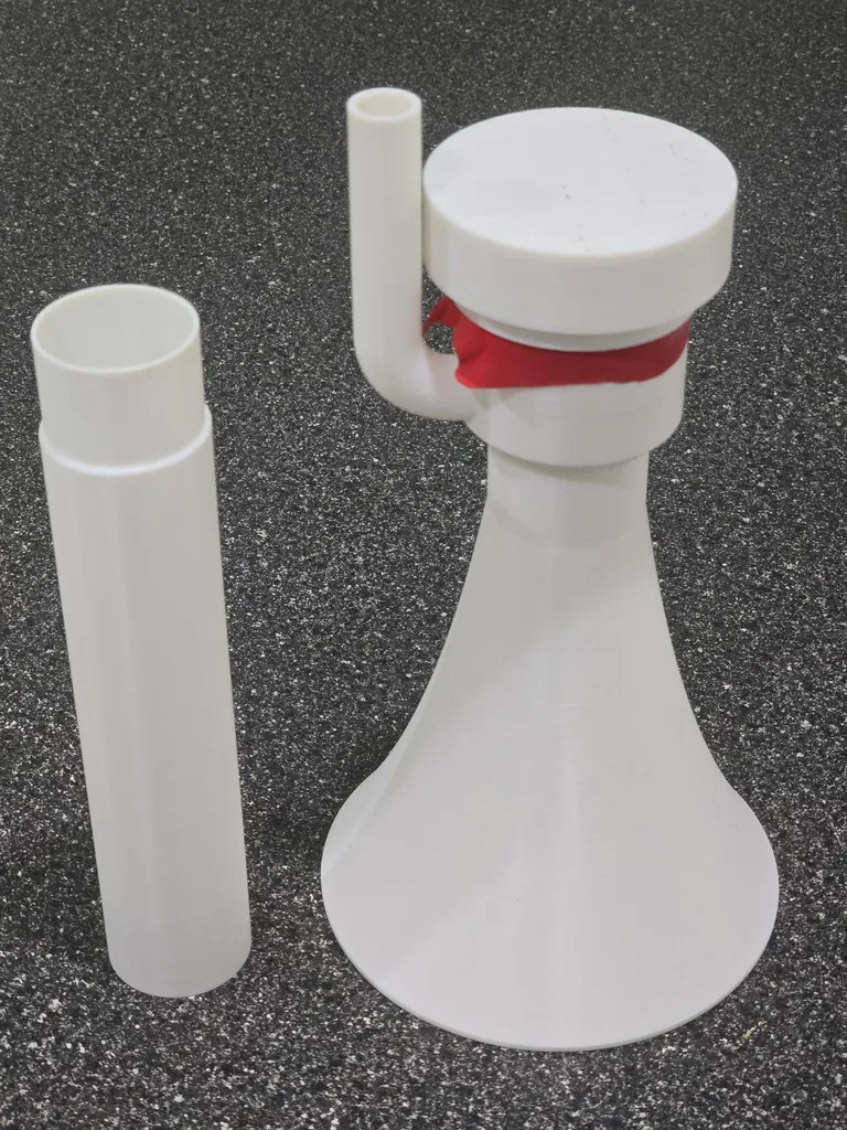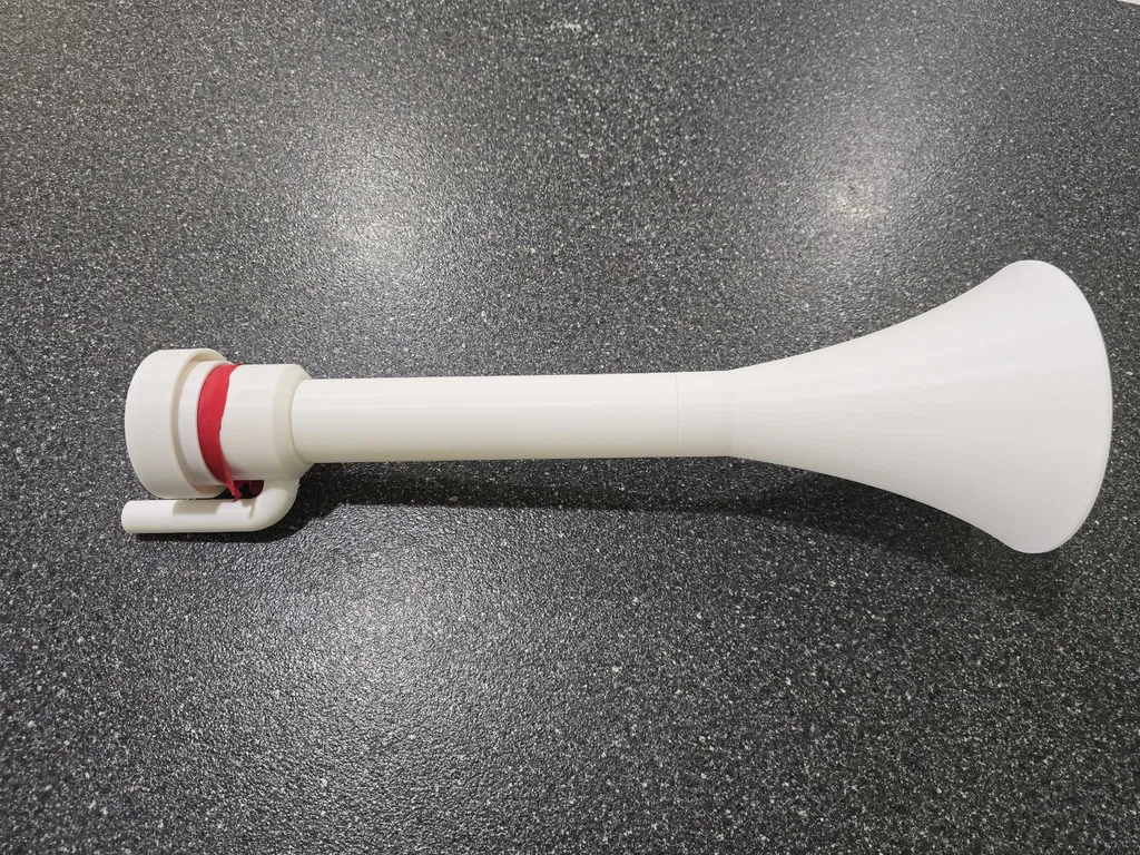 Đây là chiếc còi hơi/nhạc cụ màng rung (membranophone) cực kỳ lớn, sử dụng bong bóng làm màng rung. Đây là phiên bản lớn hơn của mẫu còi hơi nhỏ mà tôi từng thiết kế. Sản phẩm này rất phù hợp cho các sự kiện thể thao, nhưng hãy lưu ý đừng chĩa còi vào người khác ở khoảng cách quá gần - đó là cách nhanh nhất để "gây sự" đấy (nó thực sự RẤT ồn).