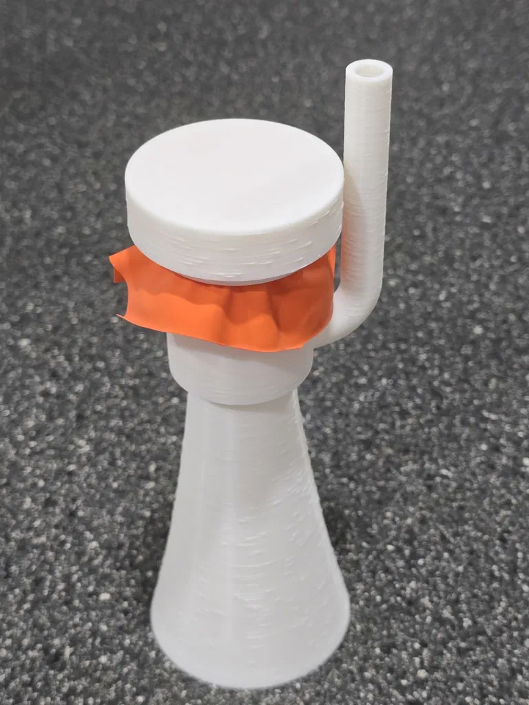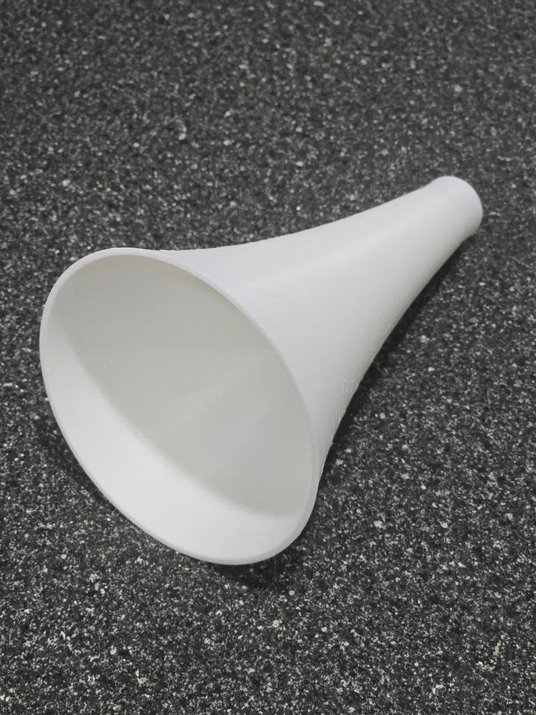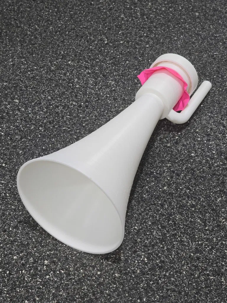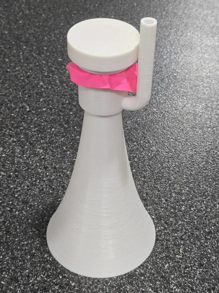 Một chiếc còi hơi/nhạc cụ màng rung nhỏ gọn nhưng RẤT LỚN, sử dụng bóng bay làm màng rung. Rất tuyệt để dùng trong các sự kiện thể thao, nhưng đừng chĩa thẳng vào người khác khi ở quá gần nhé - làm vậy dễ "gây chuyện" lắm đó (nó THẬT SỰ rất lớn). Tôi đã thử qua vài loại còi hơi/nhạc cụ màng rung khác nhưng chúng thường gây đau tai vì không có lớp bảo vệ phía sau cho người dùng. Vì vậy, tôi đã thiết kế một hệ thống tích hợp bộ phận hướng âm trên vòng giữ màng/bóng bay - nó giúp hướng các rung động từ phía sau màng rung về phía trước miệng còi. Âm thanh phía trước vẫn lớn như cũ nhưng phía sau lại dễ chịu hơn cho tai tôi. Việc lắp ráp rất dễ dàng: Cắt một miếng bóng bay và kéo căng nó qua phần đuôi của buồng cộng hưởng (đầu mở hoàn toàn). Giữ cố định rồi đặt nắp hướng âm lên để giữ chặt bóng. Bạn kéo bóng càng căng thì âm thanh càng cao. Tôi thấy khi kéo căng và dùng loại bóng dày thì âm thanh cho ra lớn hơn. Lắp phần miệng còi vào đầu còn lại của buồng cộng hưởng. Chĩa về hướng an toàn và thổi vào đầu ống ngậm. Ở đây có bốn kích cỡ miệng còi khác nhau. Loại nhỏ thì tiện hơn, nhưng càng lớn thì âm thanh phía trước càng vang. Chiếc lớn nhất có hình dạng mega-horn đầy đủ và chắc chắn là loại kêu to nhất. Có hai loại buồng cộng hưởng - loại dài có thể kêu to hơn một chút (khó phân biệt lắm), nhưng loại ngắn thì tiện lợi hơn, nhất là khi dùng chung với các miệng còi ngắn. Buồng cộng hưởng vẫn hoạt động tốt mà không cần lắp miệng còi nếu bạn muốn một phiên bản nhỏ gọn nhất. Buồng lớn hoạt động hiệu quả hơn buồng nhỏ khi dùng độc lập và tất nhiên sẽ cho âm trầm hơn một chút so với buồng ngắn. Thiết kế giúp tất cả các bộ phận in được mà không cần support, tuy nhiên chiếc miệng còi mega-phone lớn thì có thể cần thêm support ở ngay bên trong vành.
