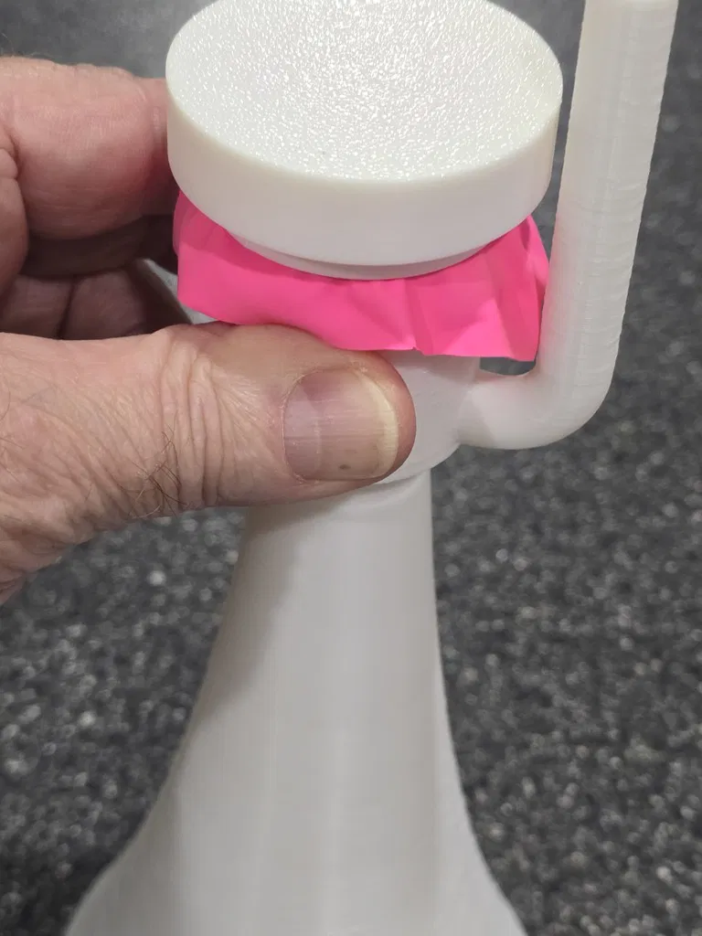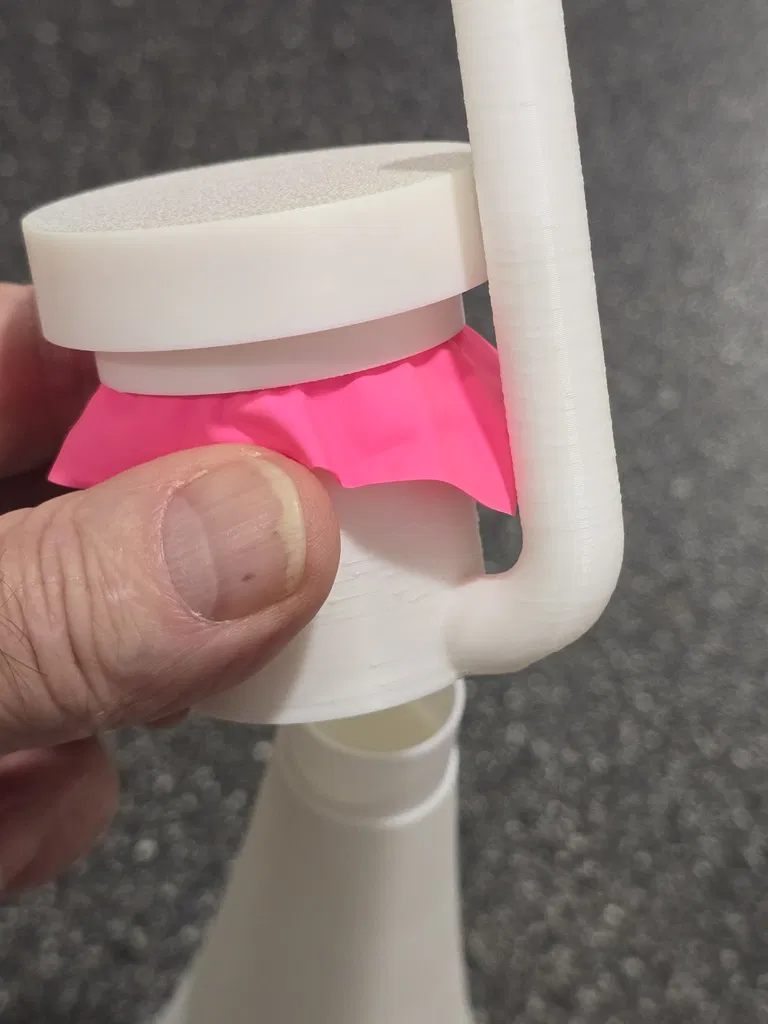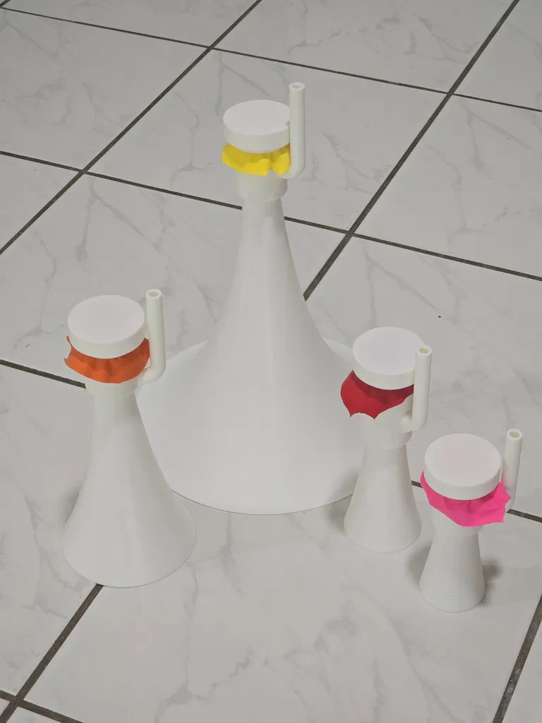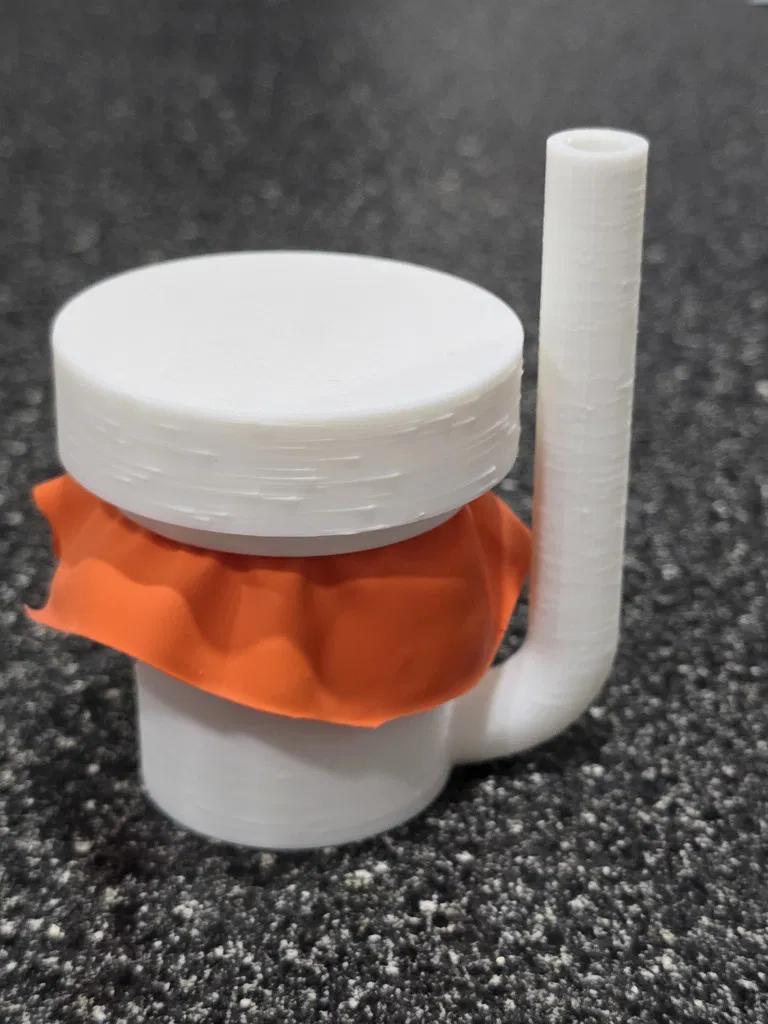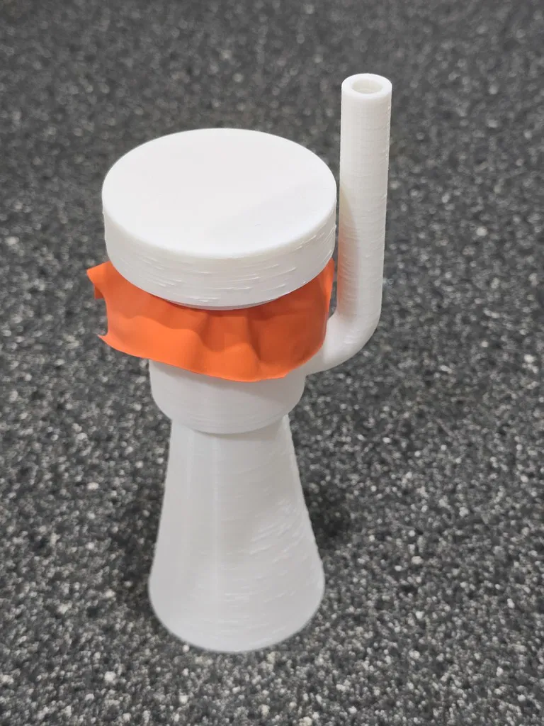 Một chiếc còi hơi/nhạc cụ màng rung nhỏ gọn nhưng RẤT LỚN, sử dụng bóng bay làm màng rung. Rất tuyệt để dùng trong các sự kiện thể thao, nhưng đừng chĩa thẳng vào người khác khi ở quá gần nhé - làm vậy dễ "gây chuyện" lắm đó (nó THẬT SỰ rất lớn). Tôi đã thử qua vài loại còi hơi/nhạc cụ màng rung khác nhưng chúng thường gây đau tai vì không có lớp bảo vệ phía sau cho người dùng. Vì vậy, tôi đã thiết kế một hệ thống tích hợp bộ phận hướng âm trên vòng giữ màng/bóng bay - nó giúp hướng các rung động từ phía sau màng rung về phía trước miệng còi. Âm thanh phía trước vẫn lớn như cũ nhưng phía sau lại dễ chịu hơn cho tai tôi. Việc lắp ráp rất dễ dàng: Cắt một miếng bóng bay và kéo căng nó qua phần đuôi của buồng cộng hưởng (đầu mở hoàn toàn). Giữ cố định rồi đặt nắp hướng âm lên để giữ chặt bóng. Bạn kéo bóng càng căng thì âm thanh càng cao. Tôi thấy khi kéo căng và dùng loại bóng dày thì âm thanh cho ra lớn hơn. Lắp phần miệng còi vào đầu còn lại của buồng cộng hưởng. Chĩa về hướng an toàn và thổi vào đầu ống ngậm. Ở đây có bốn kích cỡ miệng còi khác nhau. Loại nhỏ thì tiện hơn, nhưng càng lớn thì âm thanh phía trước càng vang. Chiếc lớn nhất có hình dạng mega-horn đầy đủ và chắc chắn là loại kêu to nhất. Có hai loại buồng cộng hưởng - loại dài có thể kêu to hơn một chút (khó phân biệt lắm), nhưng loại ngắn thì tiện lợi hơn, nhất là khi dùng chung với các miệng còi ngắn. Buồng cộng hưởng vẫn hoạt động tốt mà không cần lắp miệng còi nếu bạn muốn một phiên bản nhỏ gọn nhất. Buồng lớn hoạt động hiệu quả hơn buồng nhỏ khi dùng độc lập và tất nhiên sẽ cho âm trầm hơn một chút so với buồng ngắn. Thiết kế giúp tất cả các bộ phận in được mà không cần support, tuy nhiên chiếc miệng còi mega-phone lớn thì có thể cần thêm support ở ngay bên trong vành.