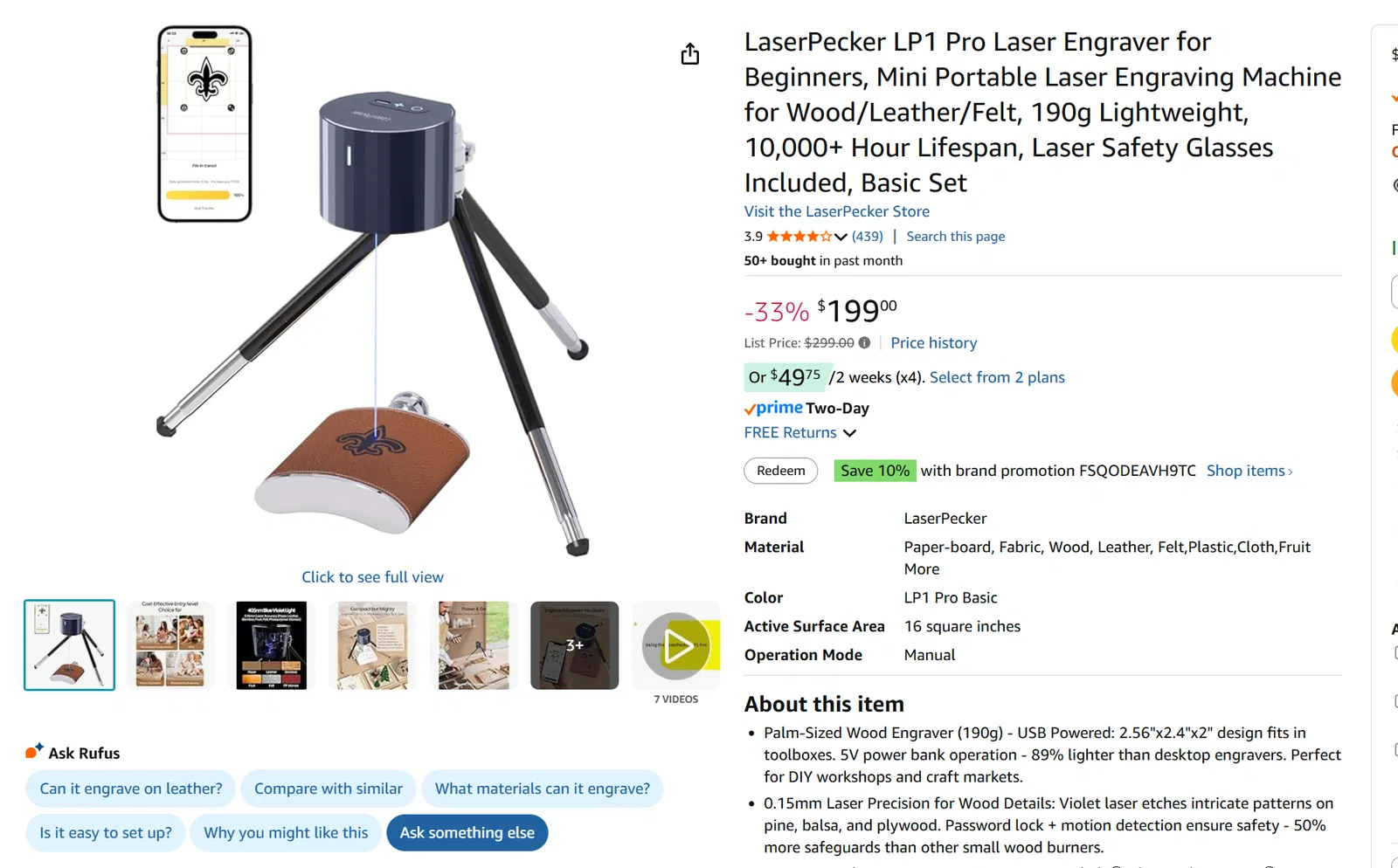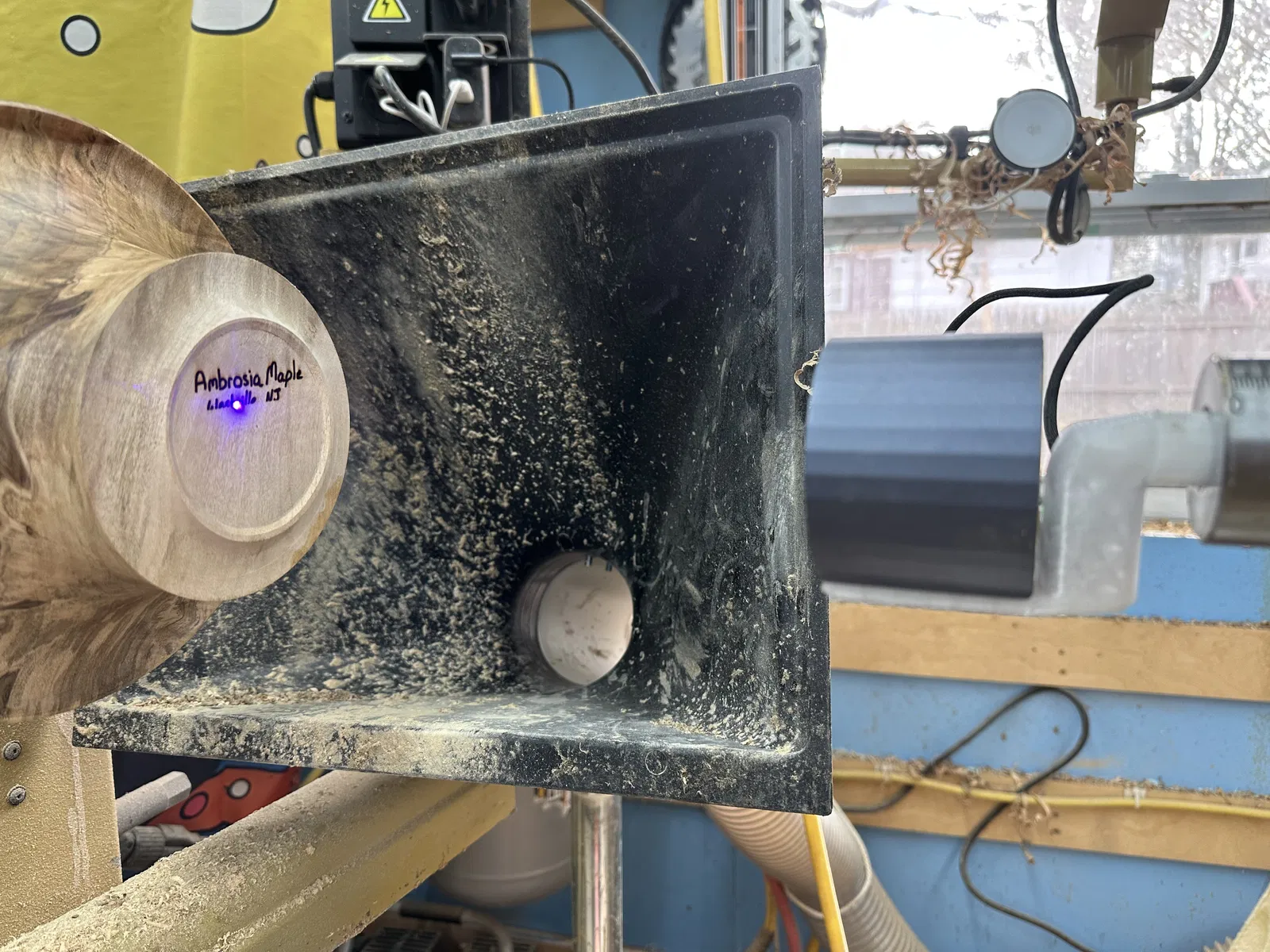 Mình chọn con máy này vì nó cực kỳ hợp túi tiền (khoảng 200 đô la), rất nhẹ (chỉ 190 gram) và vô cùng dễ dùng. Mình dùng nó chuyên để ký tên lên sản phẩm. Setup chỉ mất chưa đầy 10 giây (ụ động máy tiện là cách chuẩn nhất để đảm bảo khoảng cách chính xác giữa laser và mặt gỗ). Máy chỉ có công suất 0.5W, không bị nóng, không cần quạt tản nhiệt và chạy bằng nguồn USB nên rất tiện. Kết quả cho ra cực kỳ sắc nét. Dù nó không nhanh và không kết nối được với Illustrator, nhưng chỉ cần dùng app trên điện thoại, chụp lại hình ảnh có độ tương phản cao, app sẽ tự chuyển thành file để khắc. Bạn chỉ cần xem trước outline, nhấn start và ngồi đợi tầm 10 phút là xong. Máy hút bụi đặt sẵn gần đó có thể tận dụng để hút khói luôn nhé! (xem ảnh)