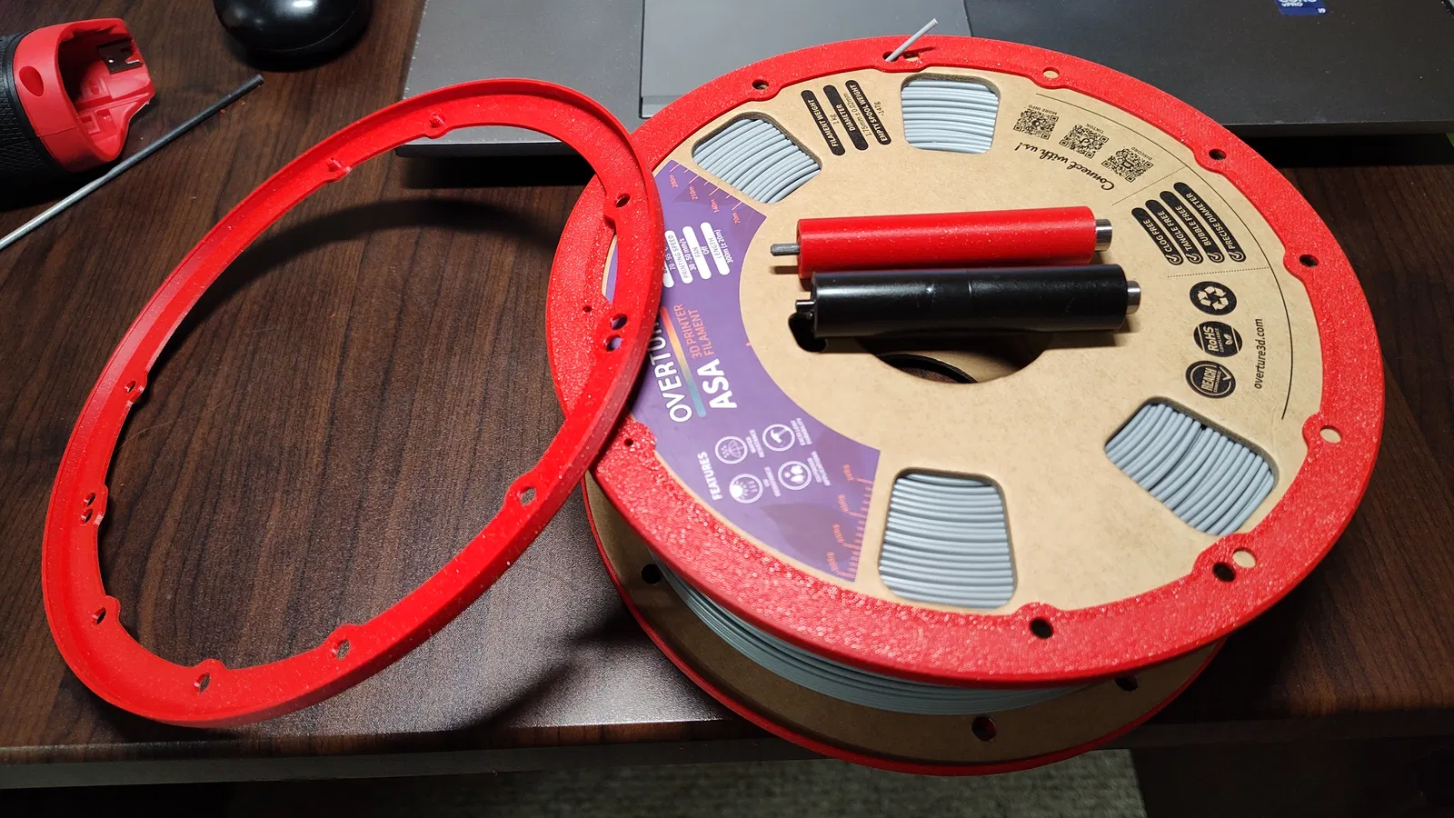 Hộp Qidi có không gian khá hạn chế để lắp vừa các cuộn nhựa ø200mm. Trong những lần in đầu tiên, mình dùng cuộn bìa của Polymaker và Overture thì vẫn chạy ổn. Tuy nhiên, phần bìa lâu ngày sẽ bị mòn, nên mình nghĩ ngay đến việc in vòng đệm (spool rings). Do không tìm thấy mẫu ưng ý, mình đã tự thiết kế trên SolidWorks và thử nghiệm rất nhiều lần. Các vòng đệm vừa với hộp thì lại quá mỏng và dễ gãy, còn các kiểu khác thì lại cạ vào nắp hộp.