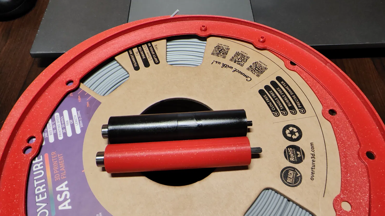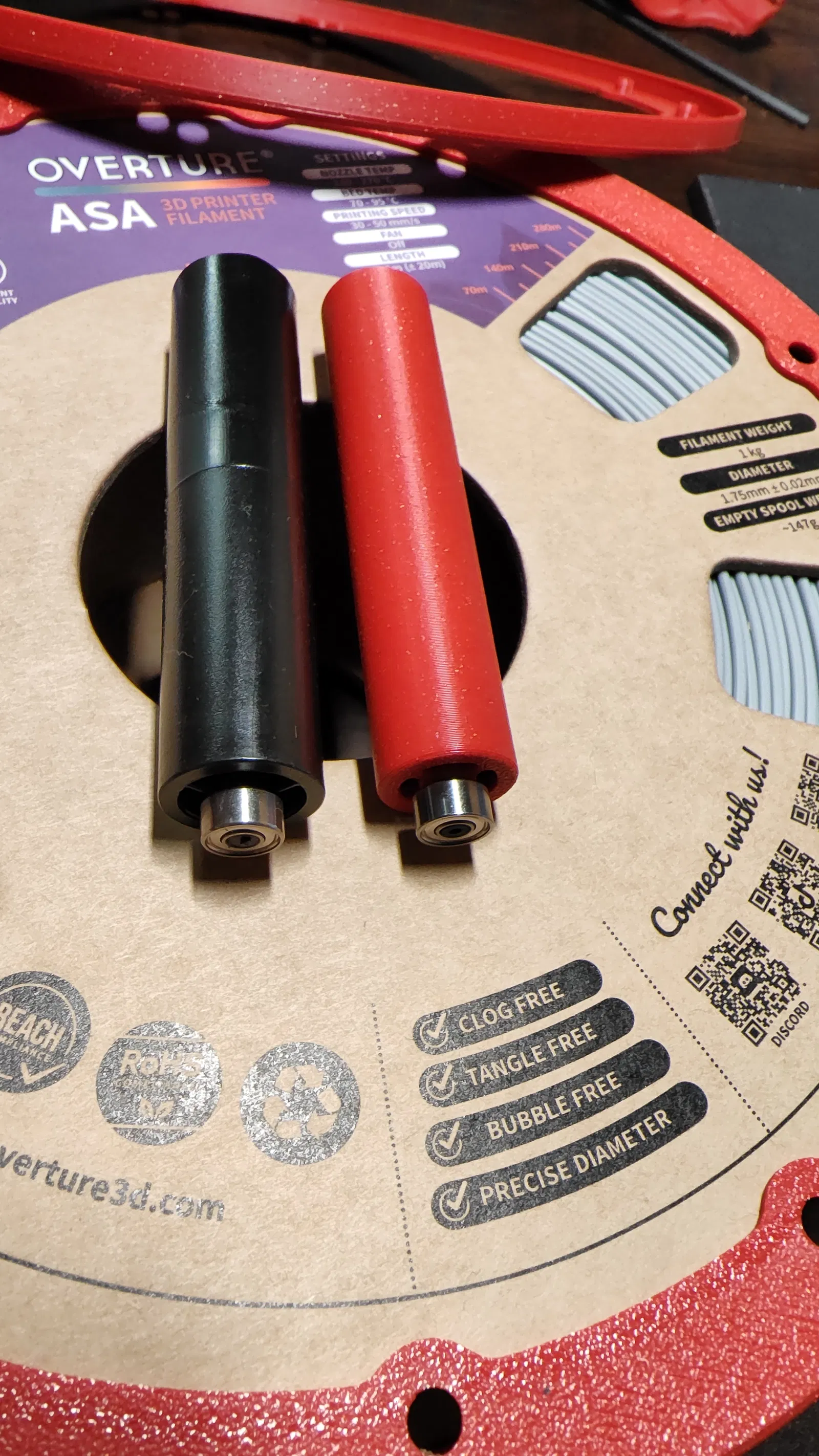Cuối cùng, mình chốt được vòng đệm có đường kính trong ø199.25mm và đường kính ngoài dưới 202mm. Dù vậy, cuộn nhựa bên phải vẫn bị cạ vào nắp hộp. Thế là mình đành phải làm điều mà ban đầu mình không muốn: in một con lăn phía sau nhỏ hơn một chút, giảm khoảng 1mm (còn ø15mm). Phần trục đầu cắm có đường kính ø3mm để vừa với vòng bi. Mình thấy trục in bằng nhựa ASA rất dễ gãy, nên đã mua sẵn thanh carbon 3mm để thay thế. Nếu bạn dùng trục in, hãy cẩn thận khi lắp cụm con lăn/vòng bi vào hộp. Riêng phần lỗ con lăn, mình khuyên các bạn nên dùng mũi khoan 3mm để khoan lại cho chuẩn thay vì chỉnh kích thước lỗ ngay trên file thiết kế.