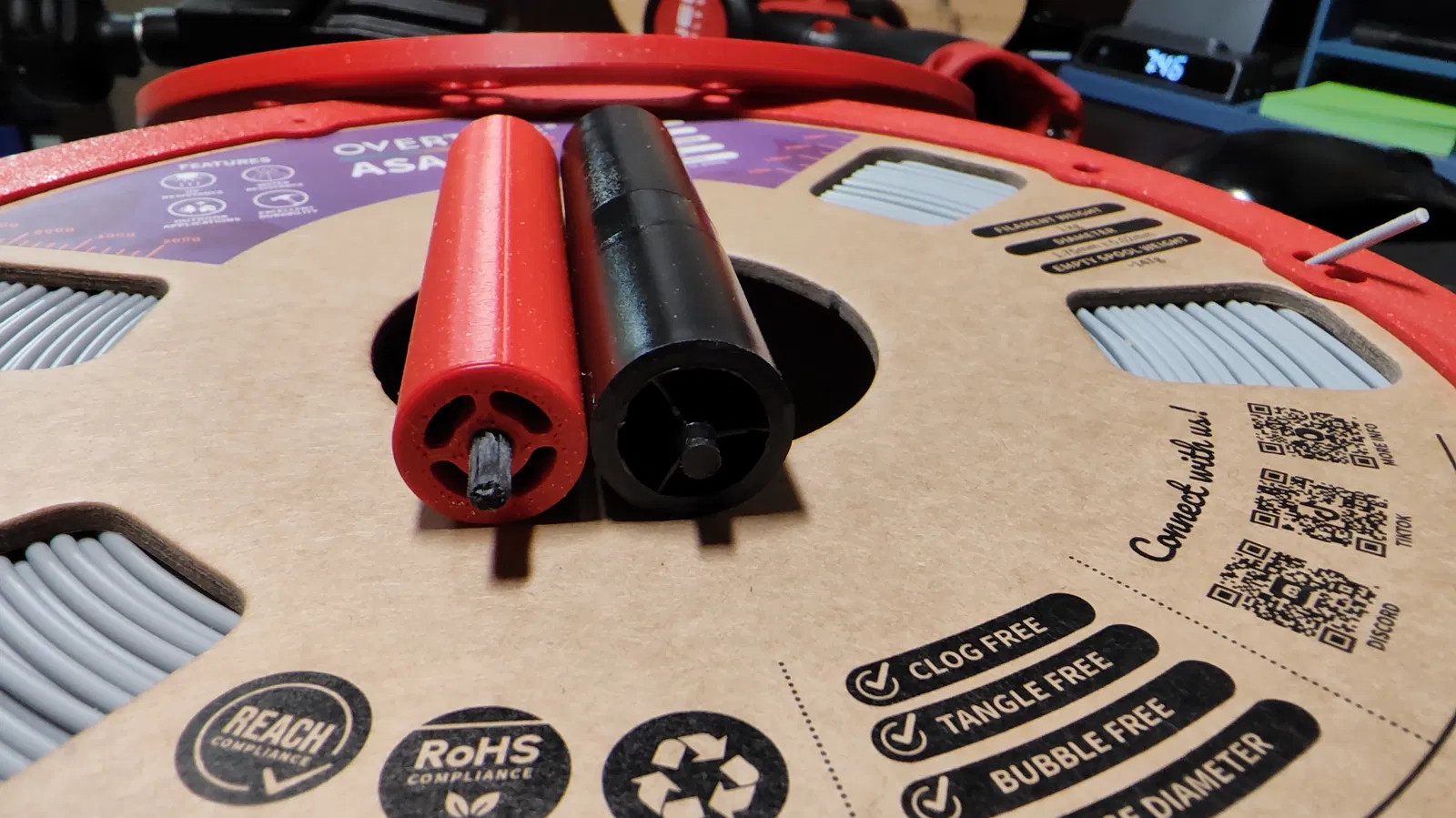 Giải pháp vòng đệm in 3D cho cuộn nhựa bìa Polymaker/Overture và con lăn phía sau đường kính 15mm giúp máy Qidi Q2 vận hành êm ái hơn mà không bị cạ nắp hộp. Thiết kế tối ưu, khắc phục nhược điểm về không gian hẹp của máy.